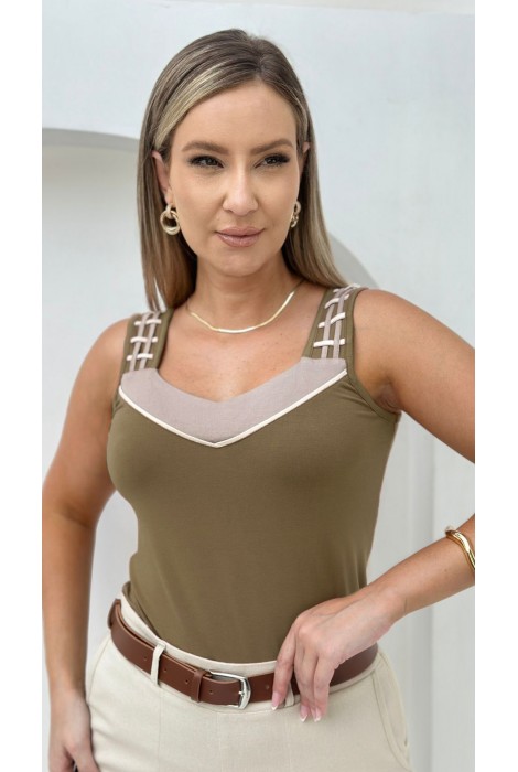 Blusa regata lisa, decote V com recorte. Alças duplas com detalhes de tiras de tecido.. Peça toda confeccionada em malha e extremo conforto e um excelente caimento.