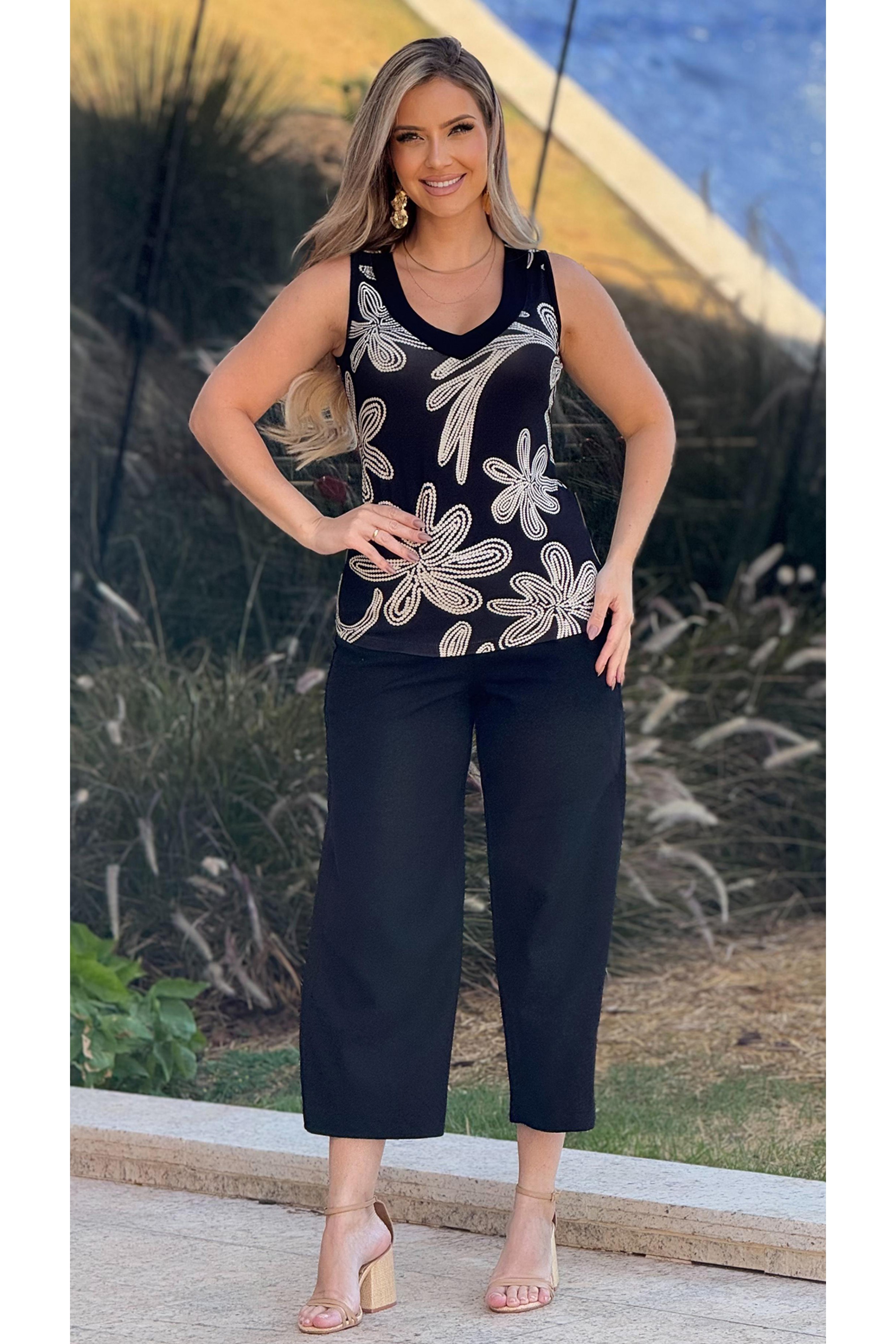 Blusa regata com estampa exclusiva Ramany. Decote V com recorte duplo em tecido liso preto. Peça toda confeccionada em malha e extremo conforto e um excelente caimento.