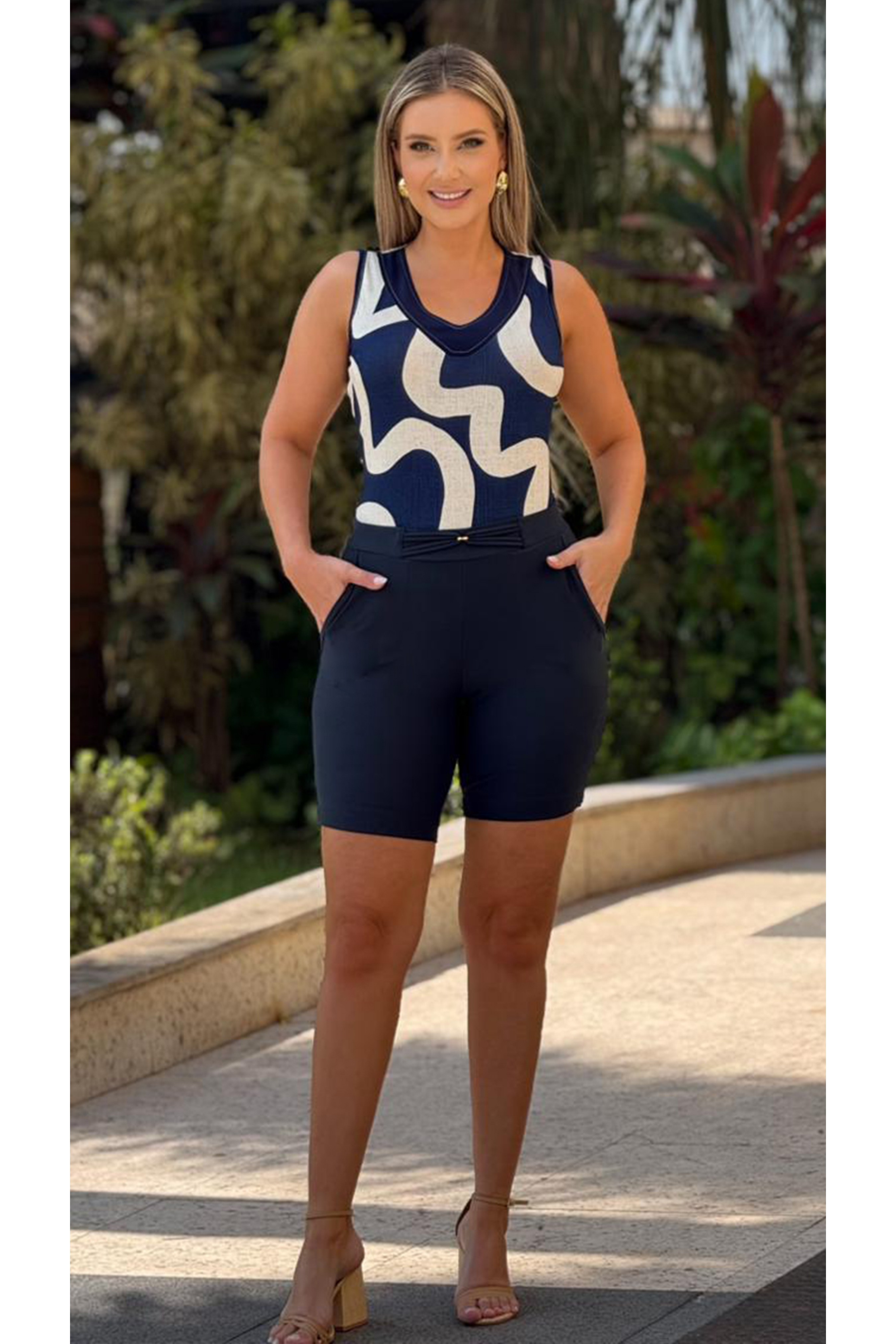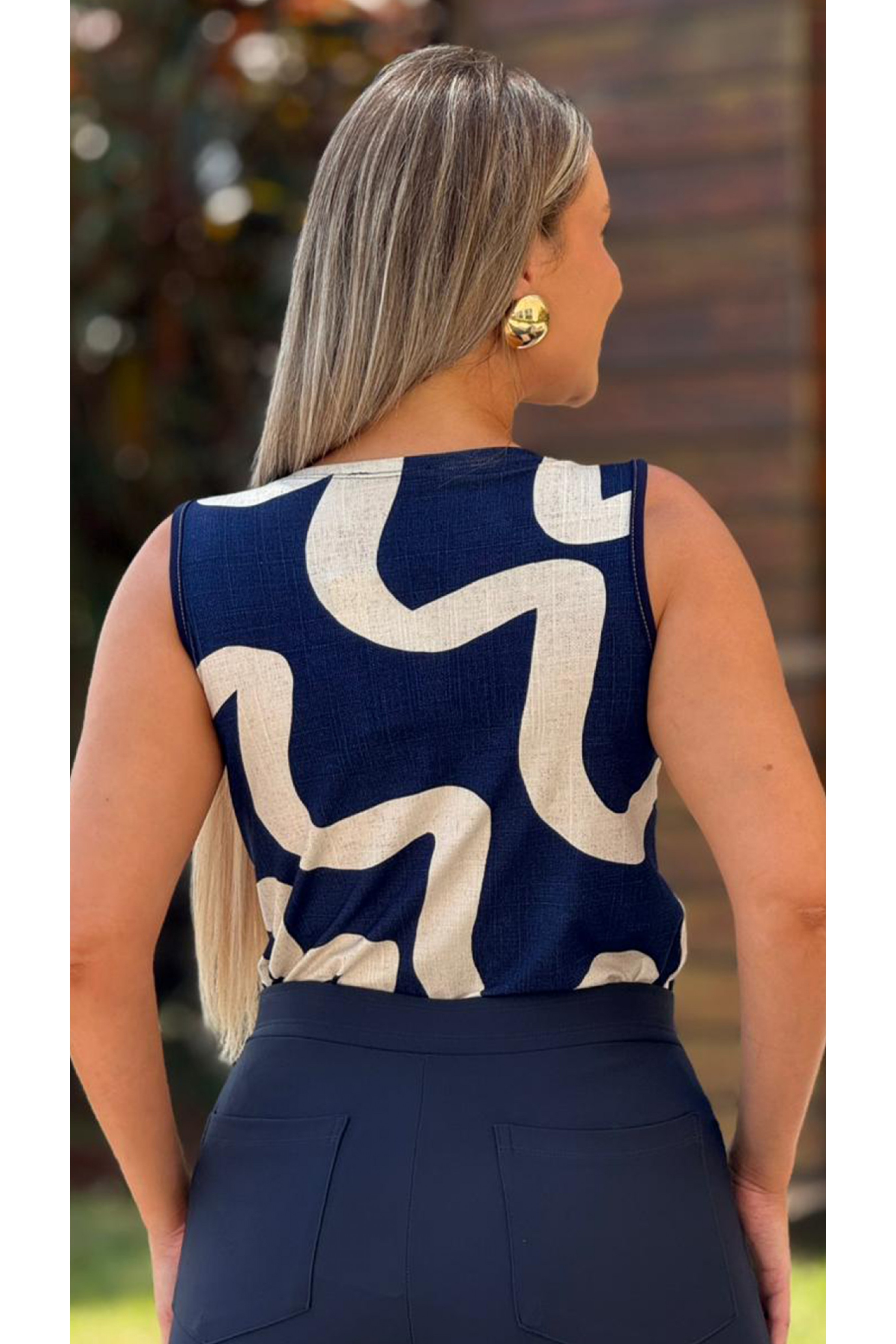 Blusa regata com estampa abstrata exclusiva Ramany. Decote V com recorte duplo em malha azul. Cava em malha azul marinho. Peça toda confeccionada em malha e extremo conforto e um excelente caimento.