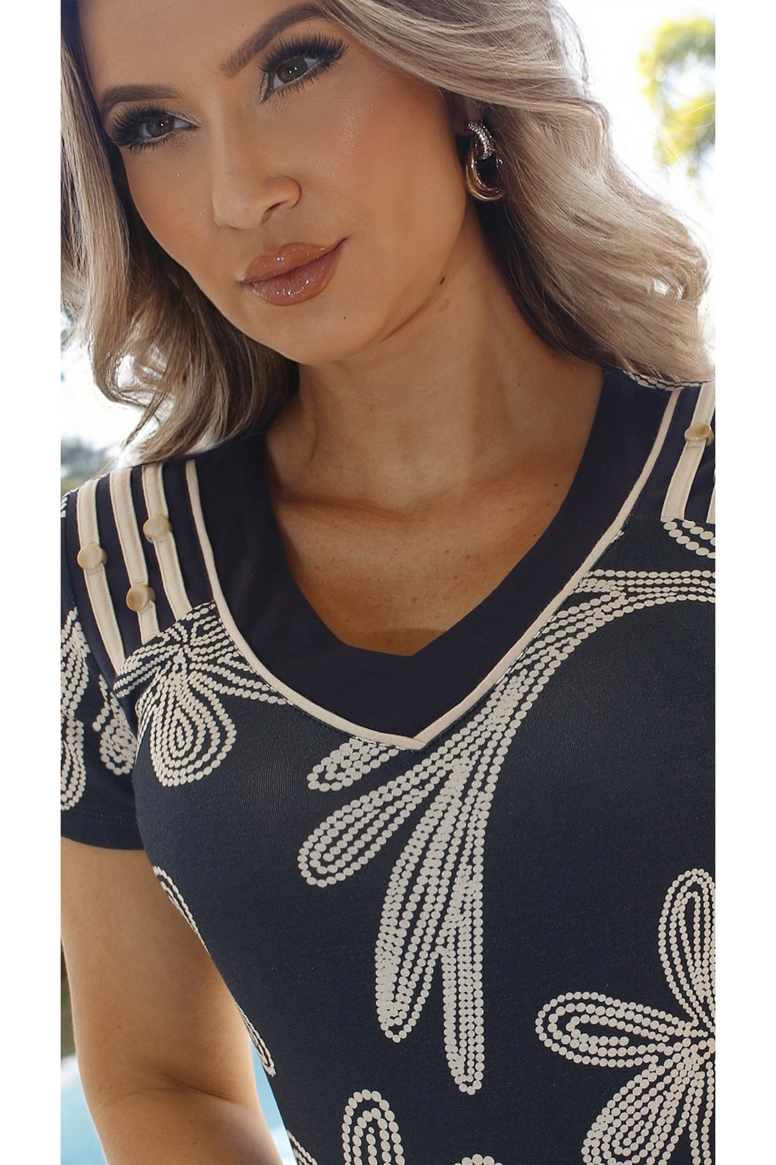 Blusa manga curta com estampa exclusiva Ramany decote V. Ombros com detalhes de tiras de tecido e peças de acrílico. Mangas com punhos duplos com detalhes de vivo. Peça toda confeccionada em malha e extremo conforto e um excelente caimento.