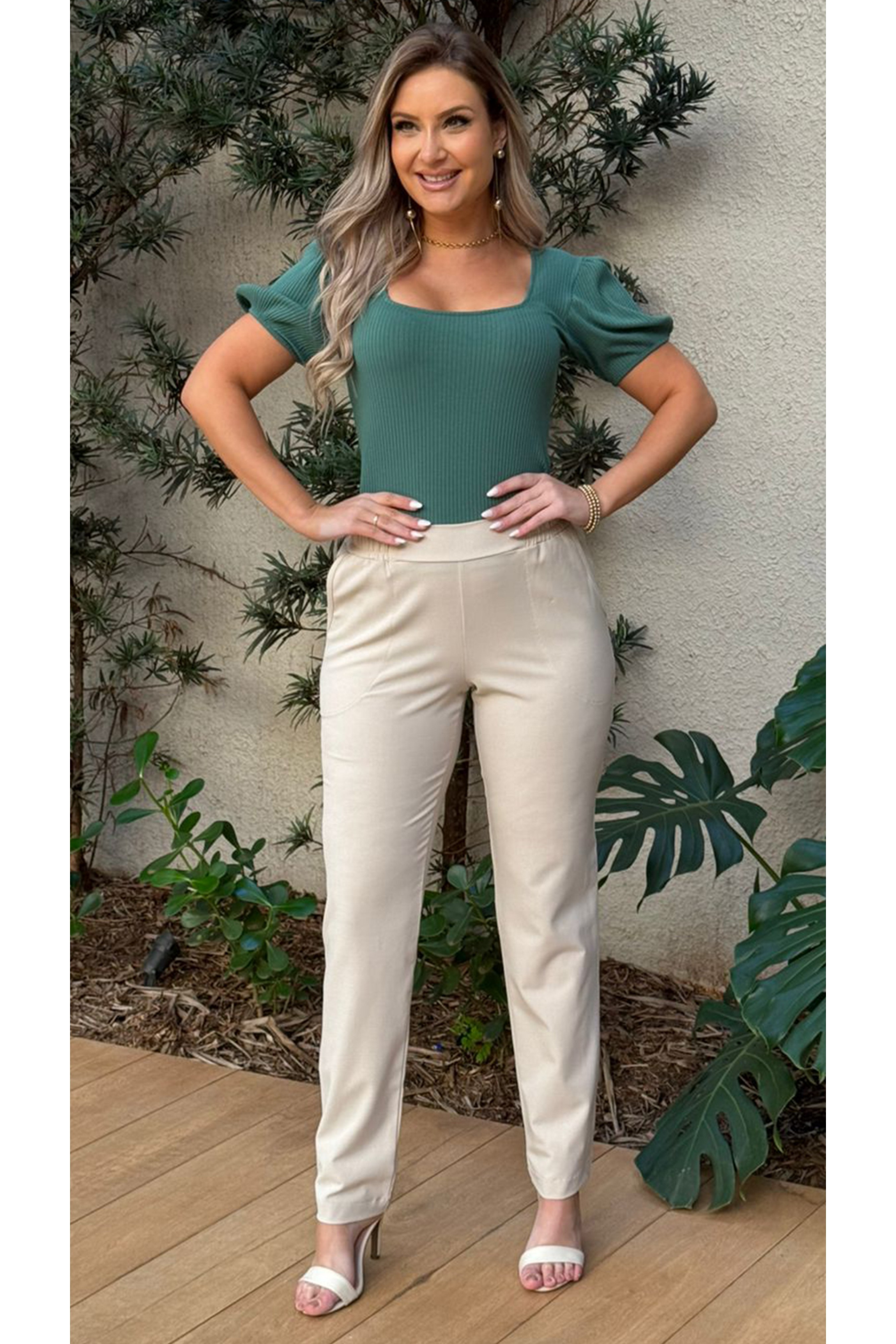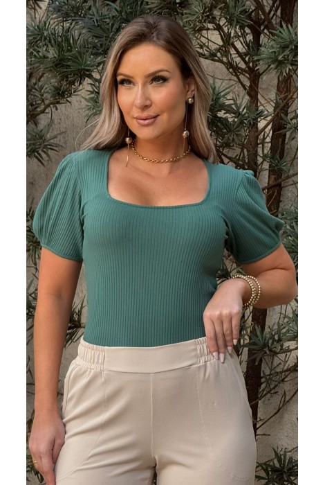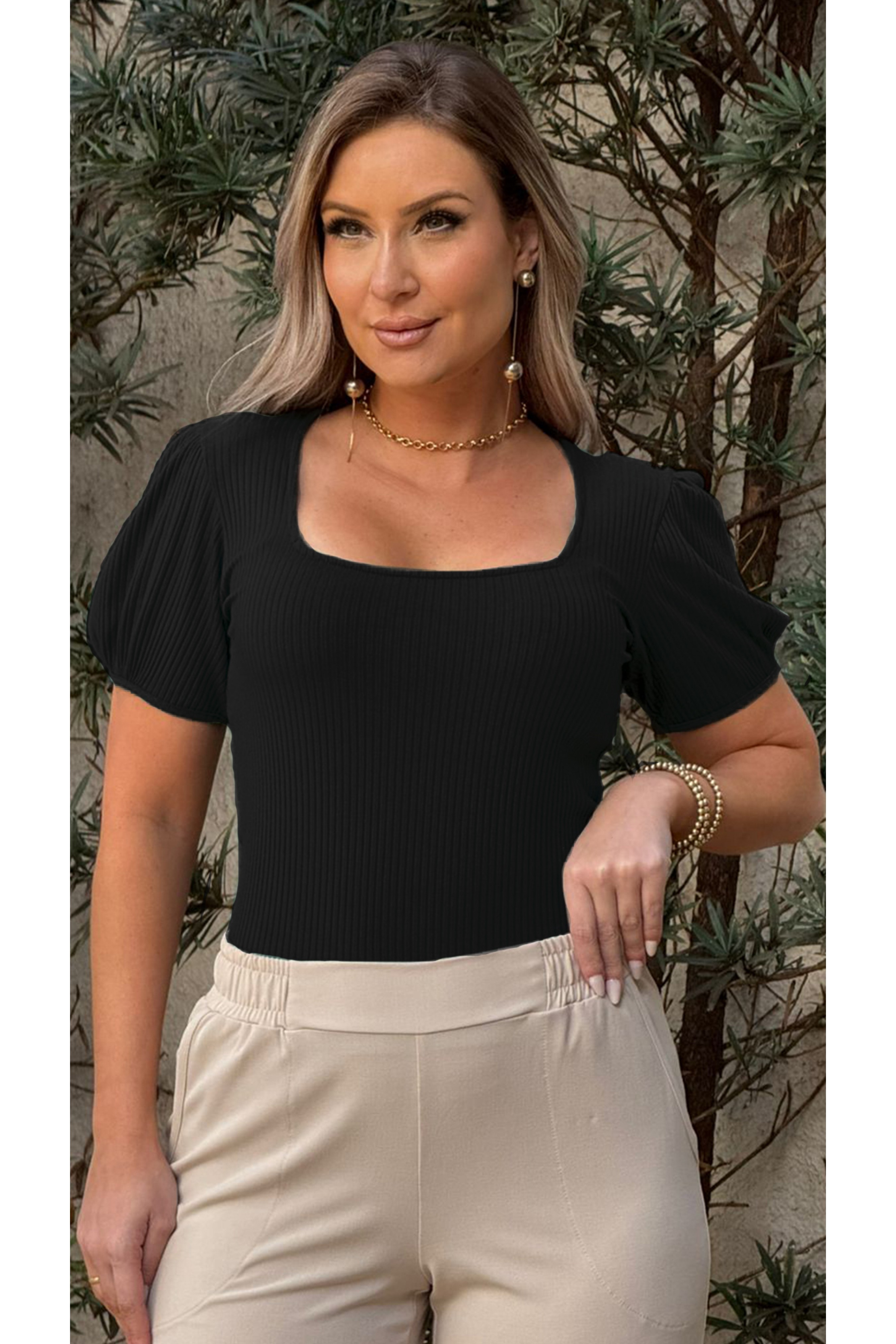 Blusa manga curta com malha canelada, decote quadrado com mangas bufantes. Peça toda confeccionada em malha e extremo conforto e um excelente caimento.