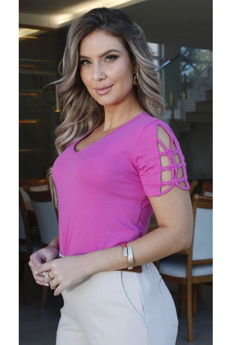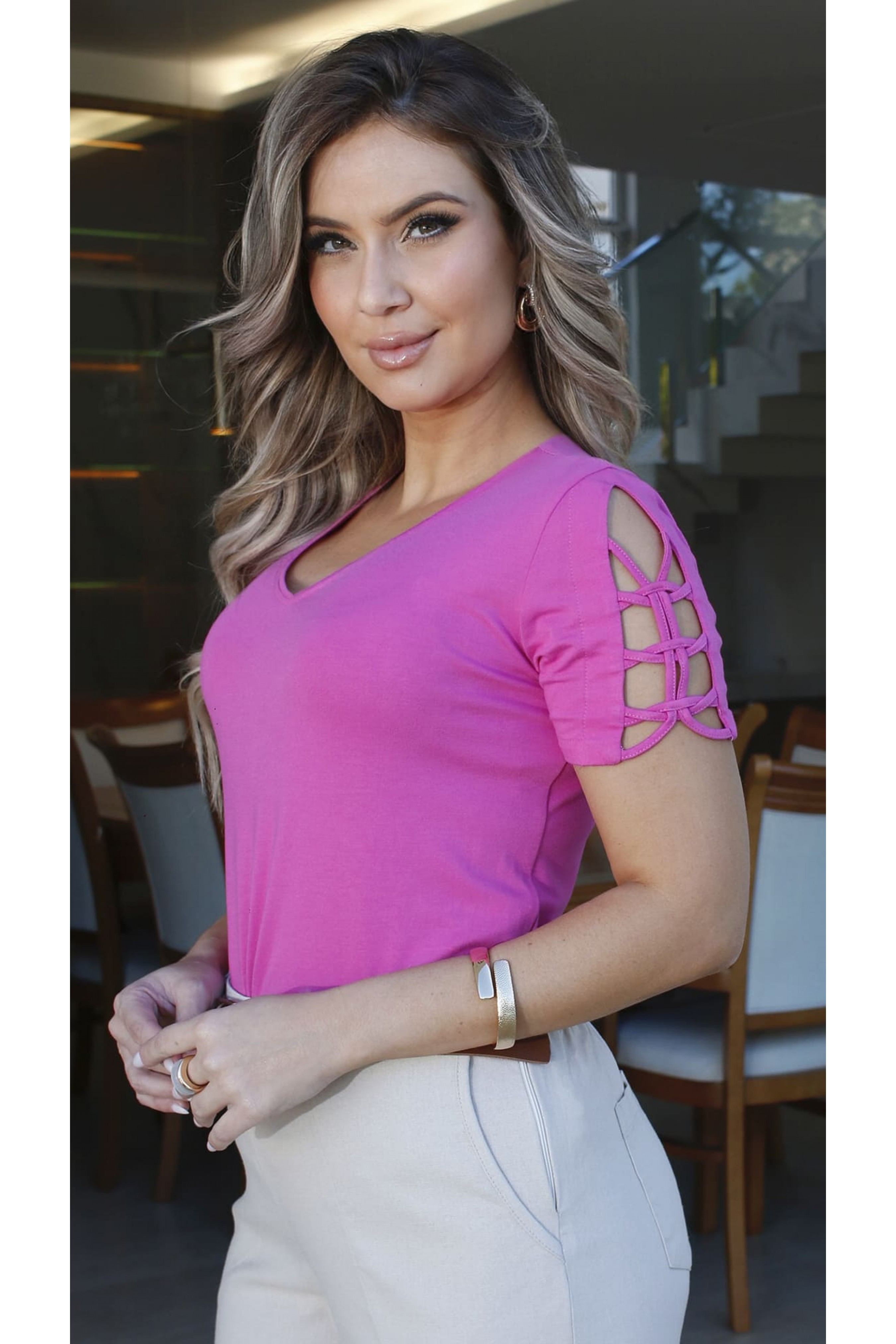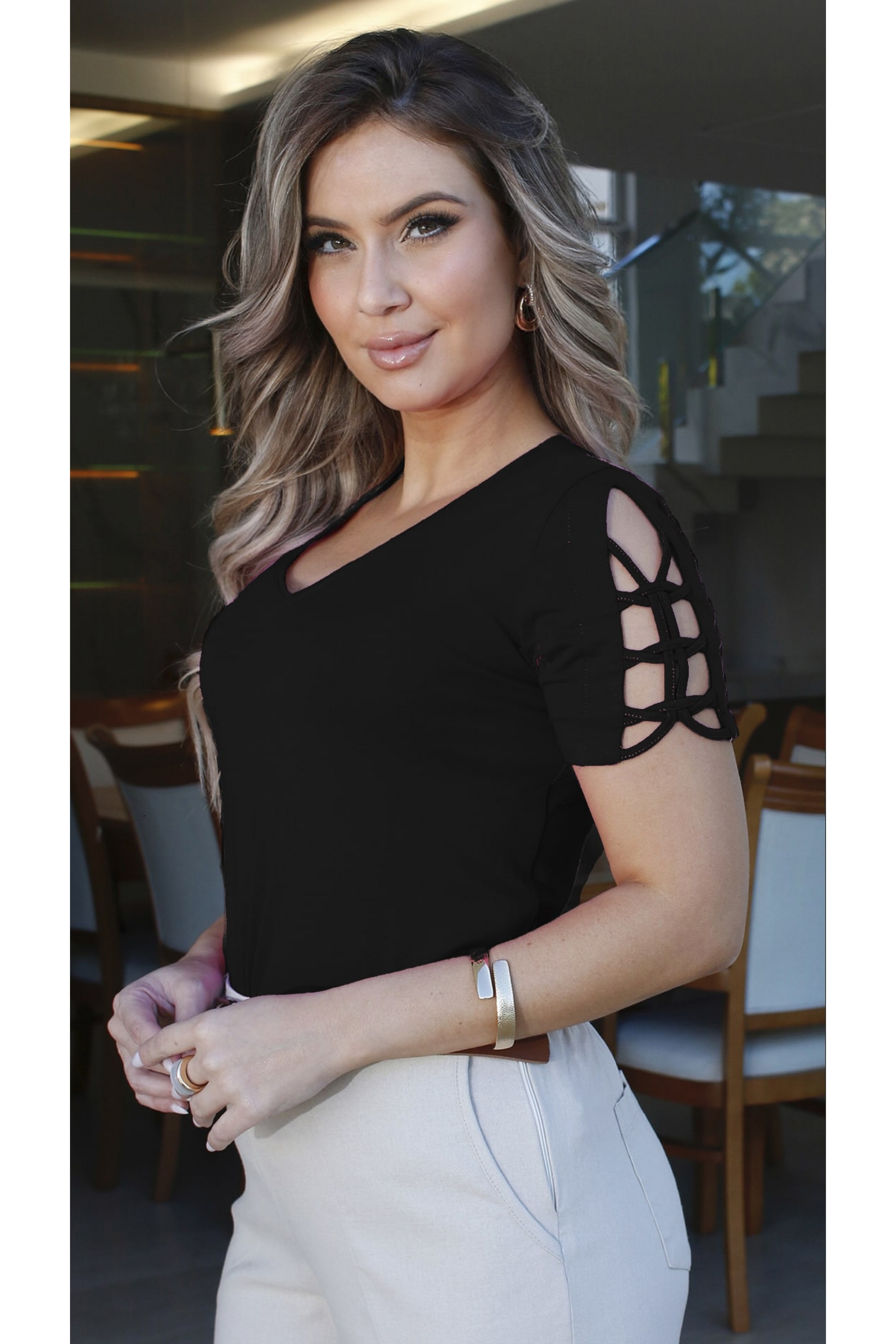 Blusa manga curta lisa decote V. Recortes nas mangas com detalhes de tiras de tecido entrelaçadas. Peça toda confeccionada em malha e extremo conforto e um excelente caimento.
