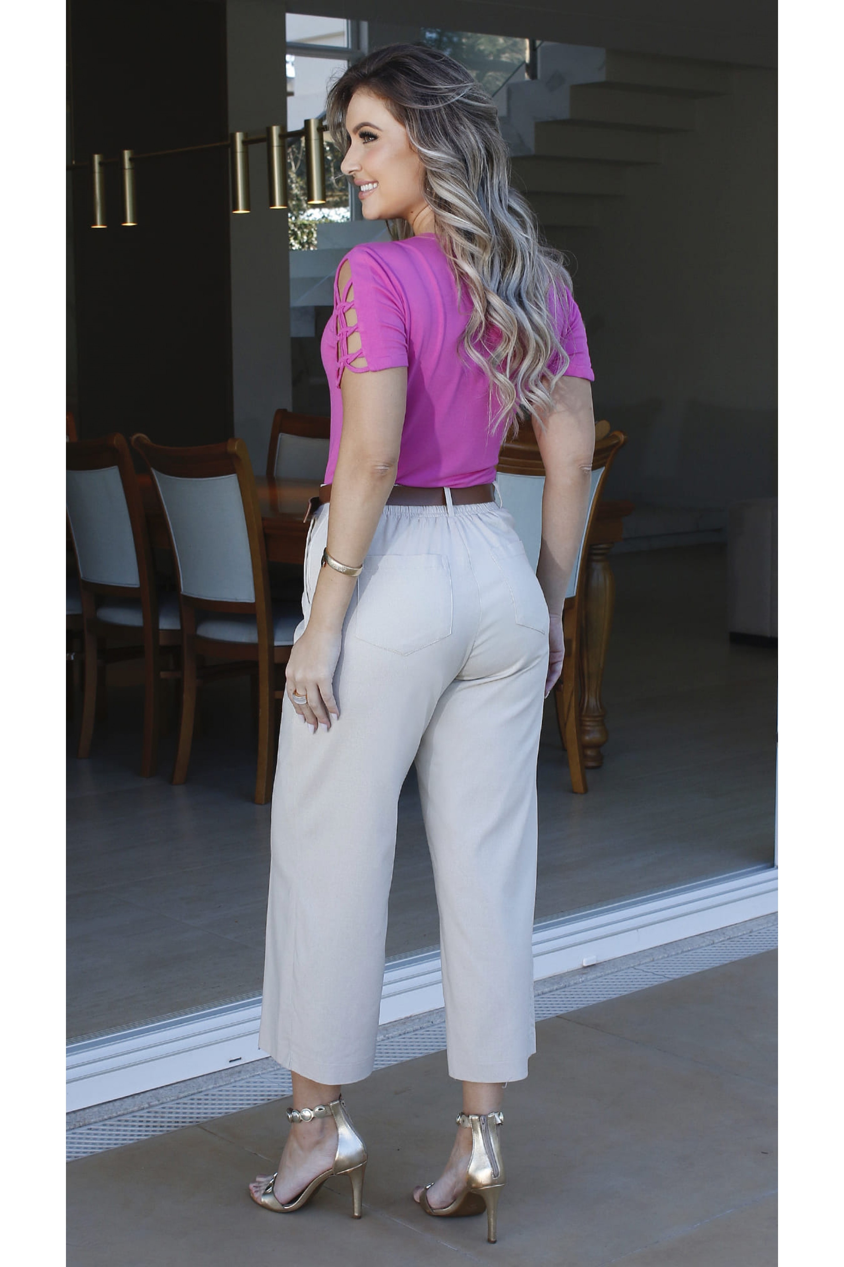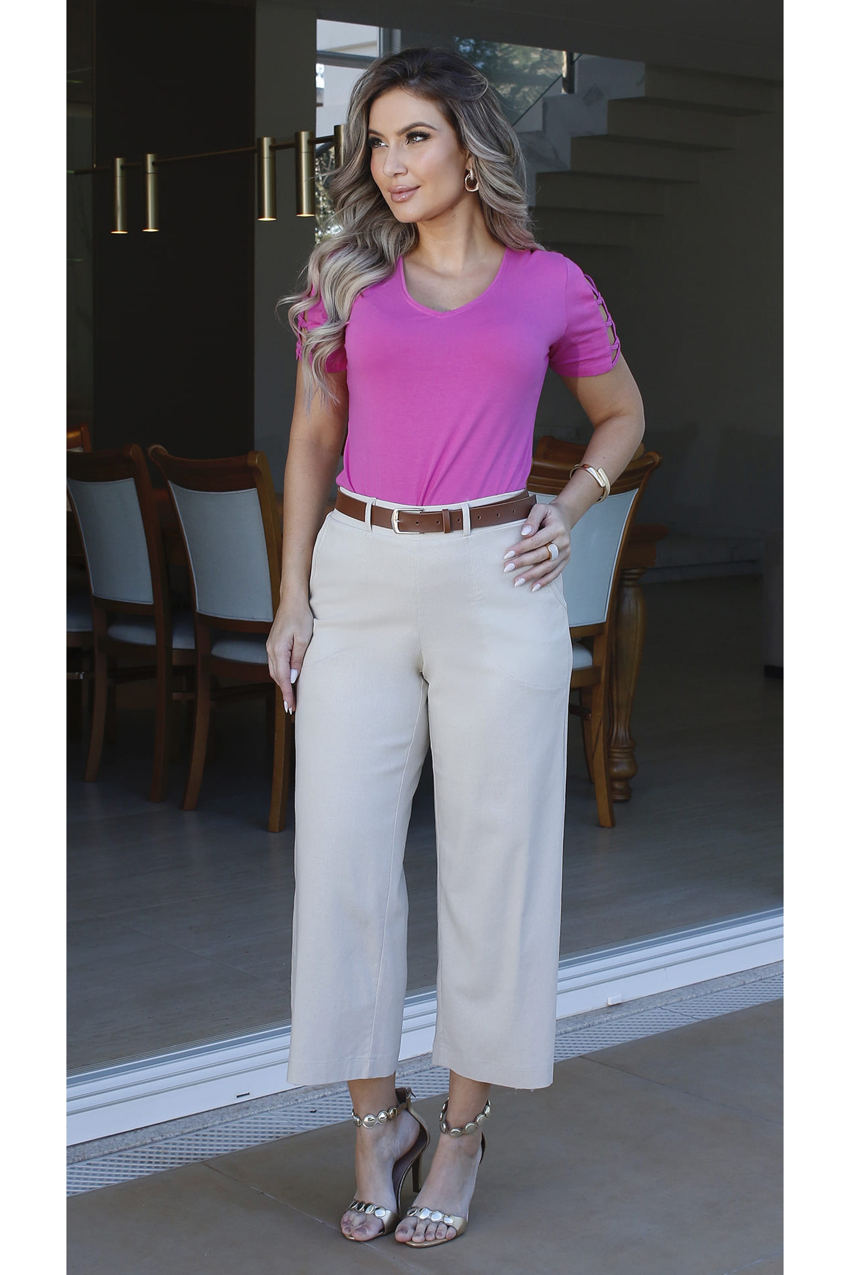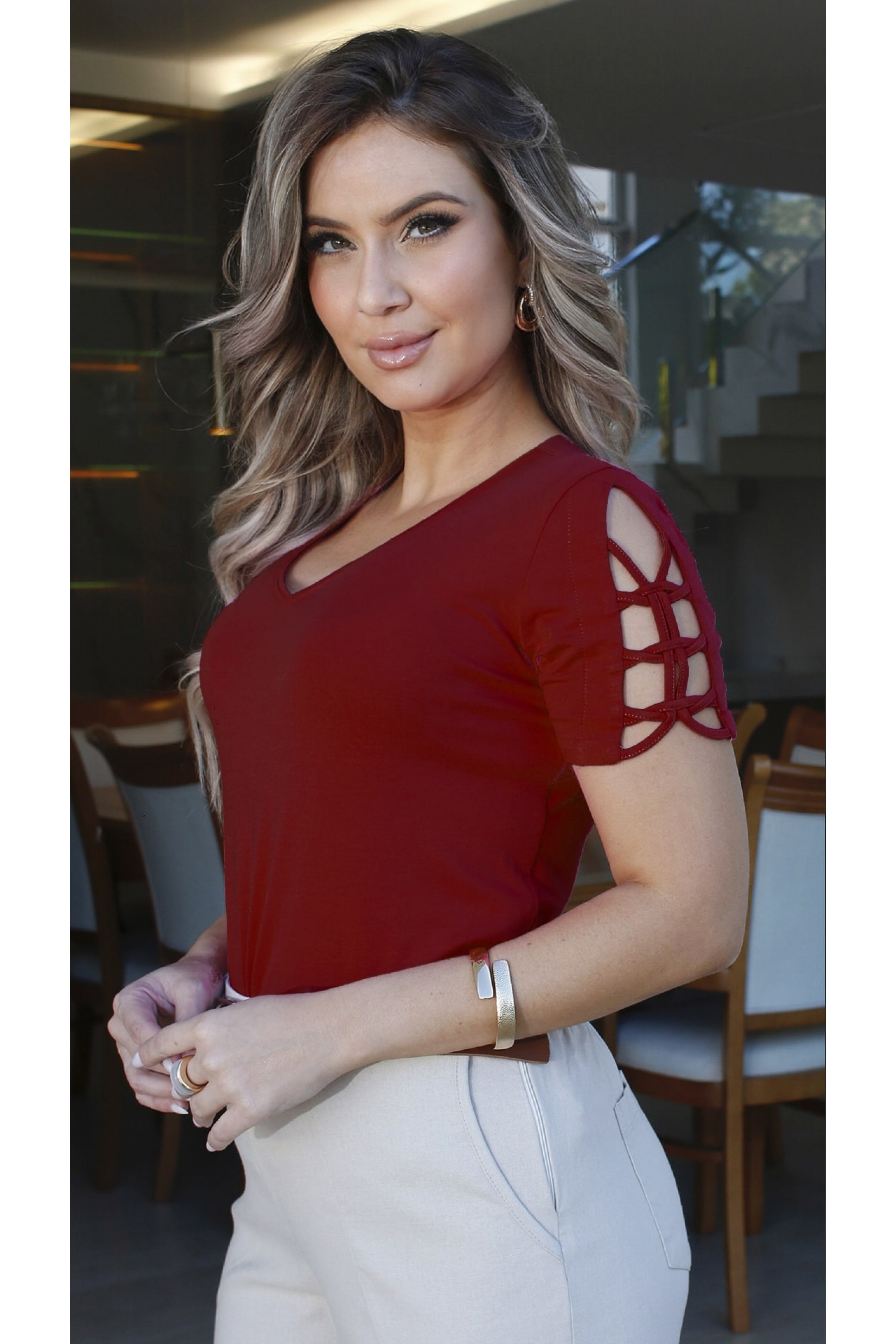 Blusa manga curta lisa decote V. Recortes nas mangas com detalhes de tiras de tecido entrelaçadas. Peça toda confeccionada em malha e extremo conforto e um excelente caimento.
