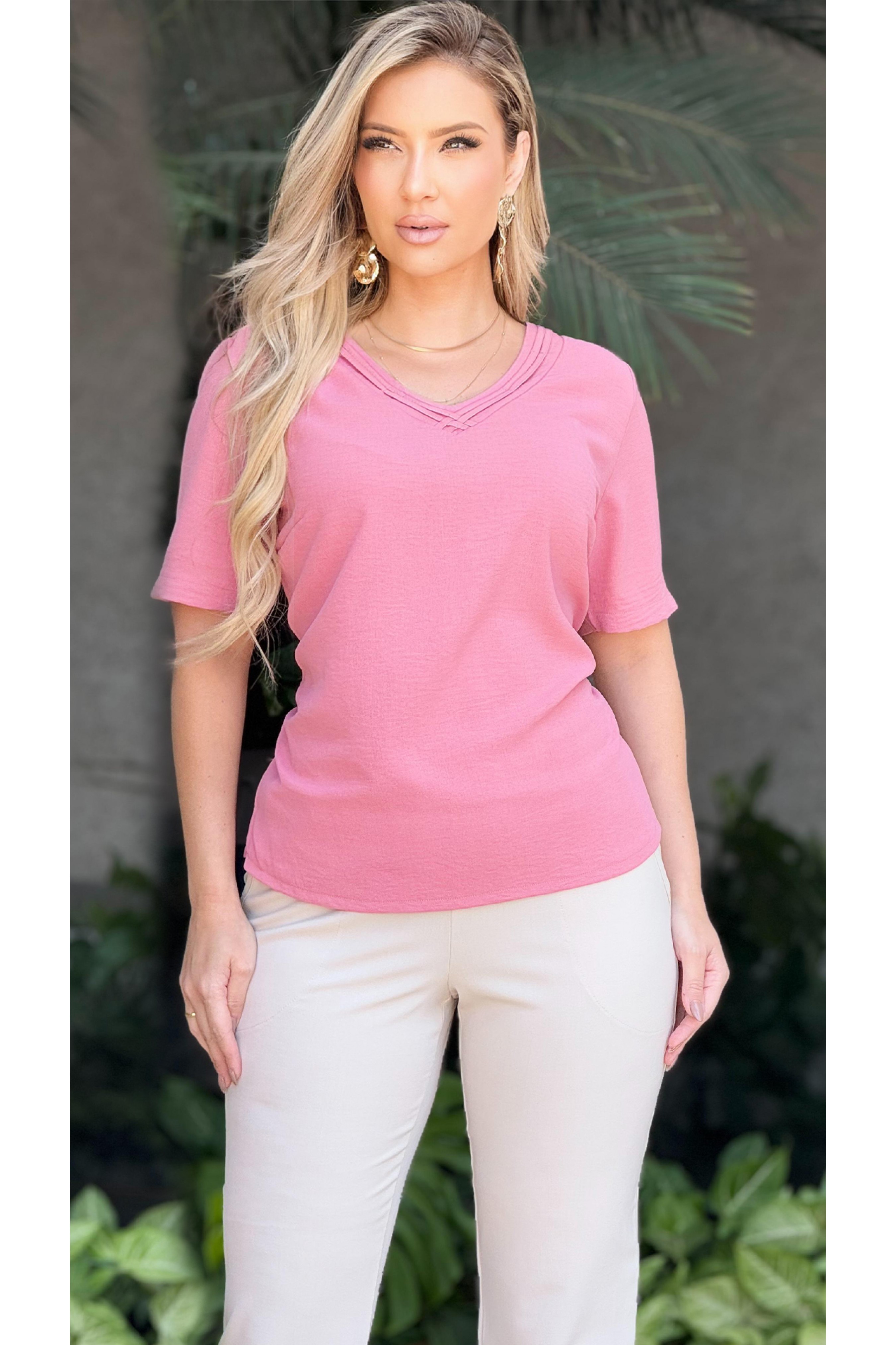 - SKU: 034504 Blusa Manga Curta Ramany de Tecido Plano