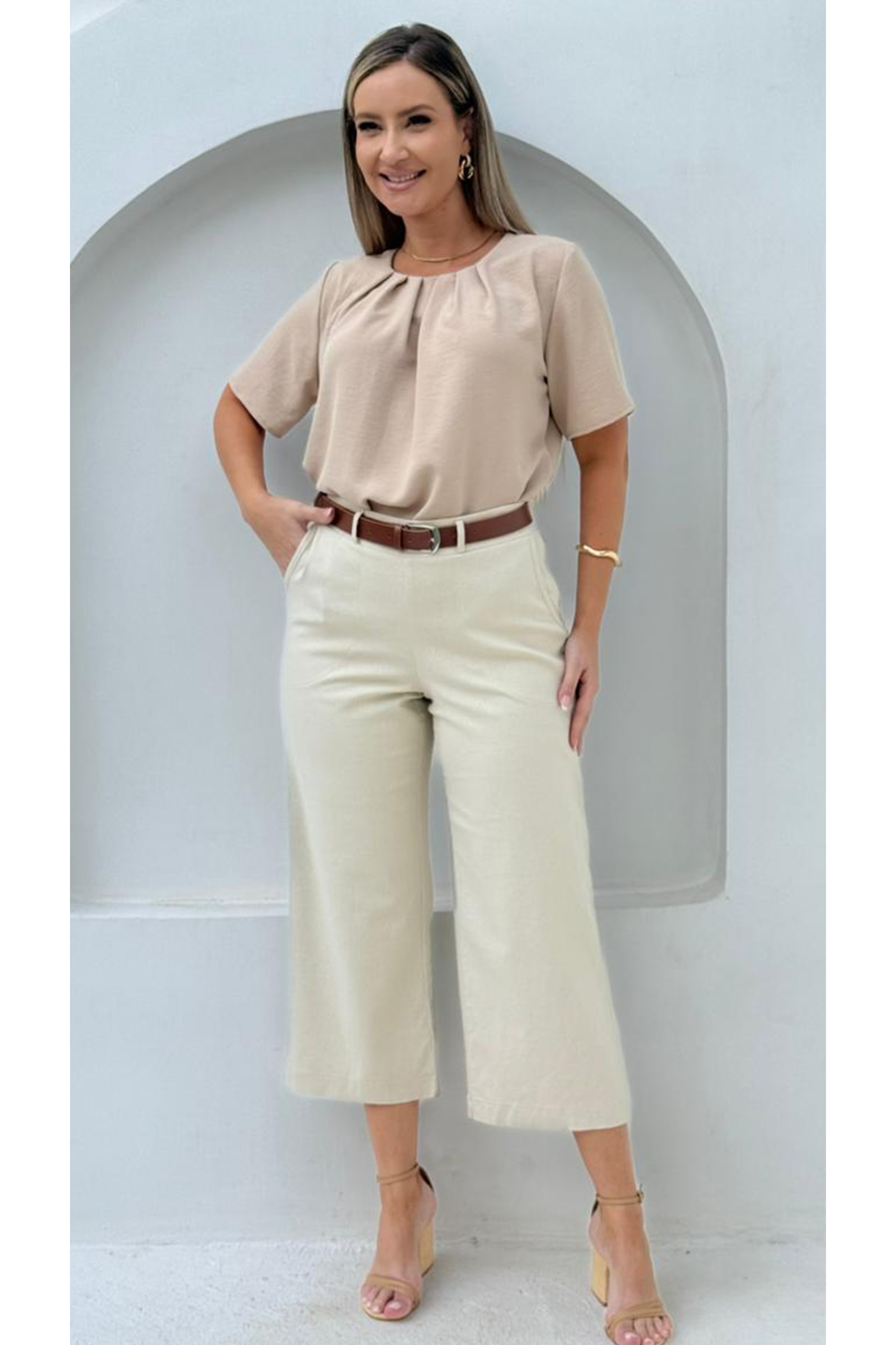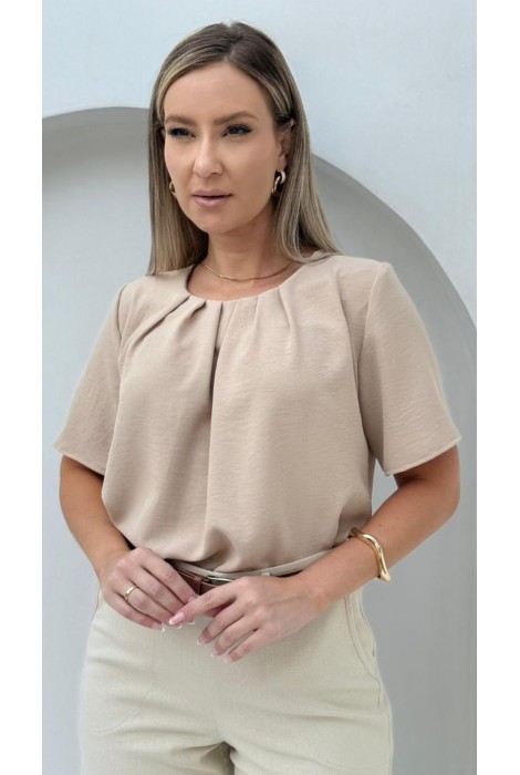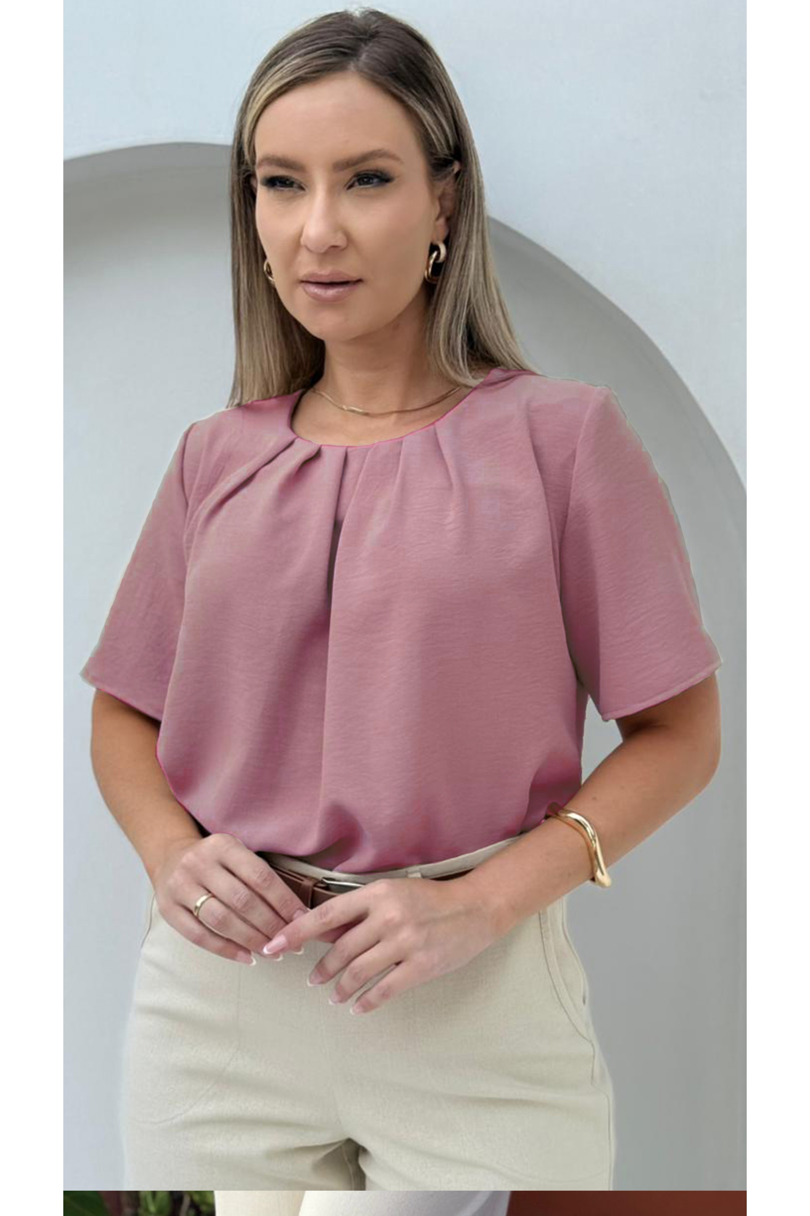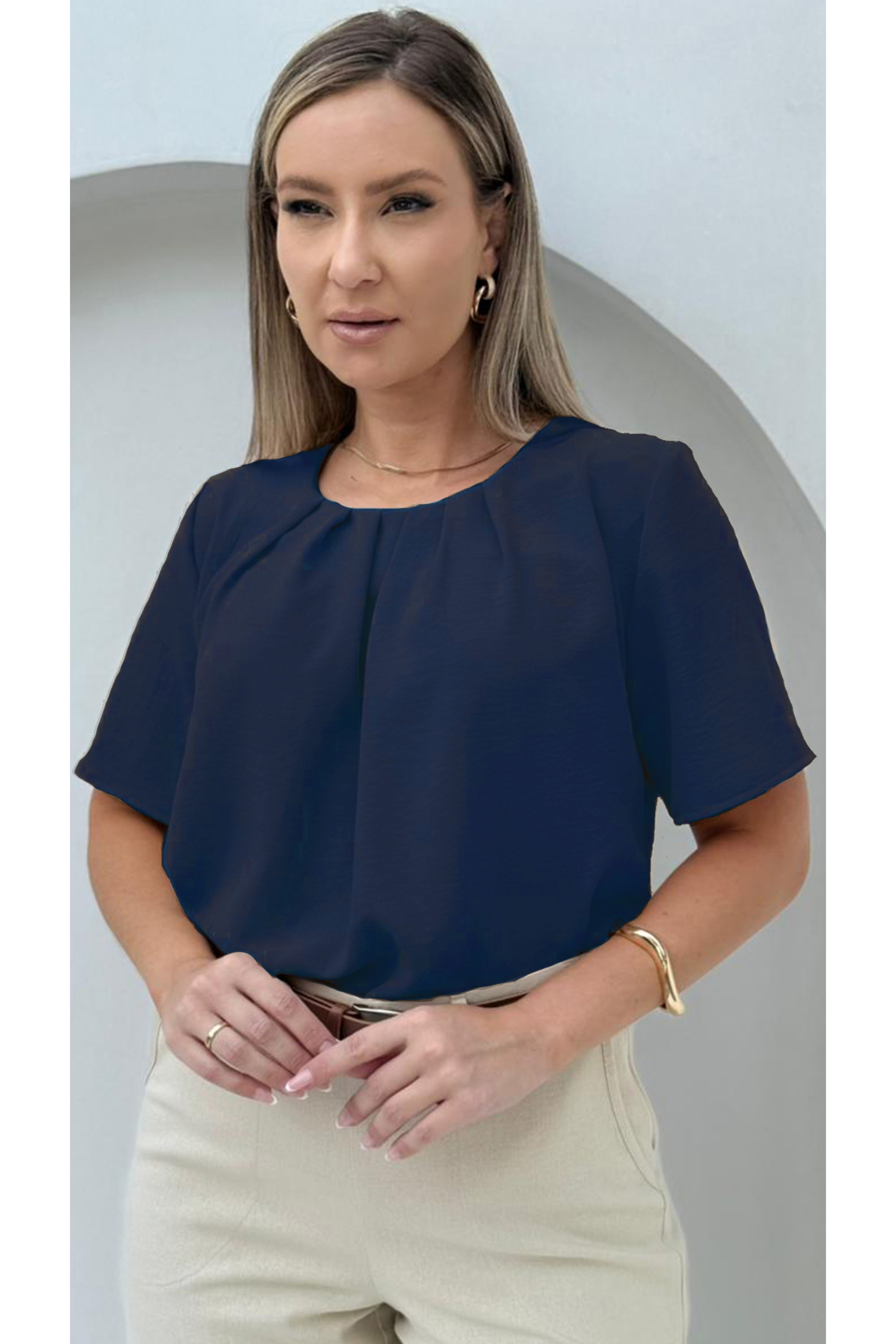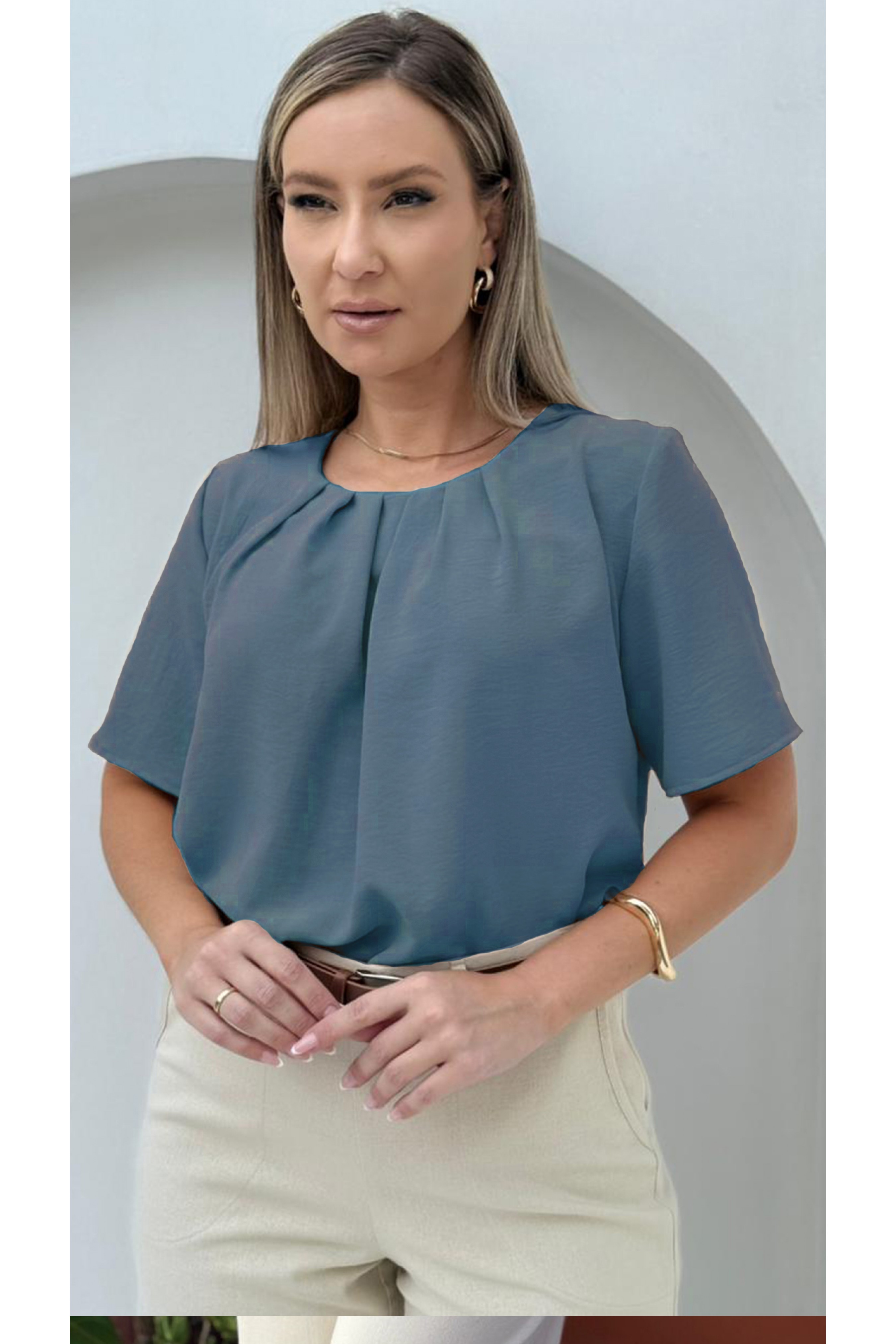 Blusa manga curta Ramany. Decote redondo com pregas e abertura nas costas com botão. Peça toda confeccionada em tecido de extremo conforto e um excelente caimento.