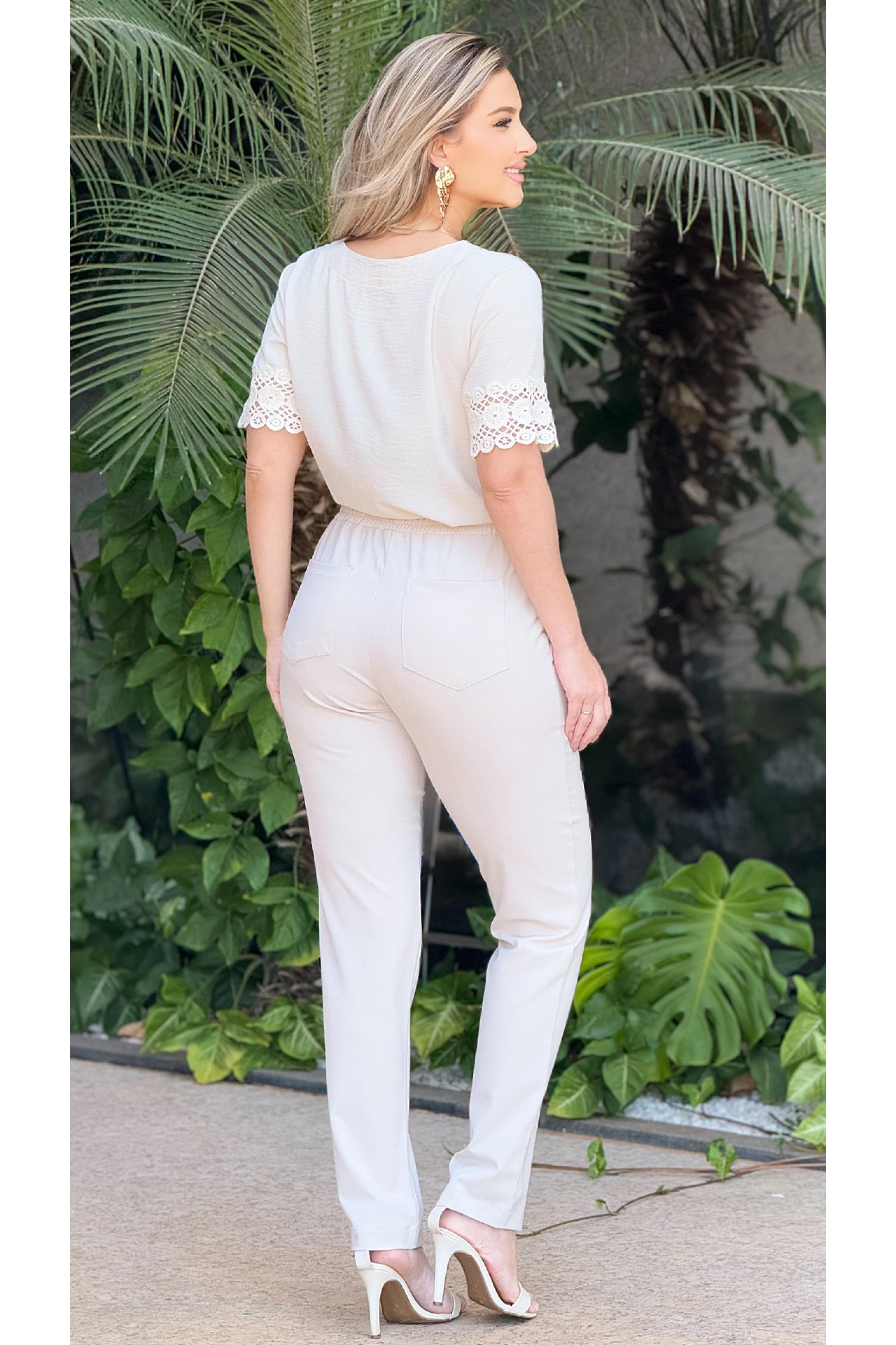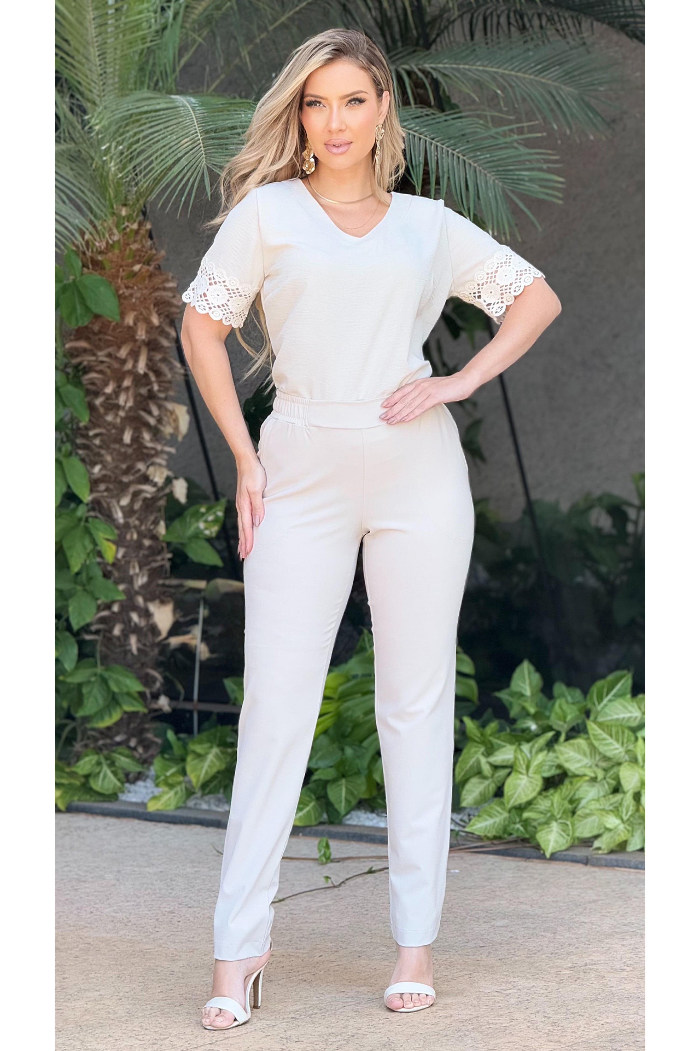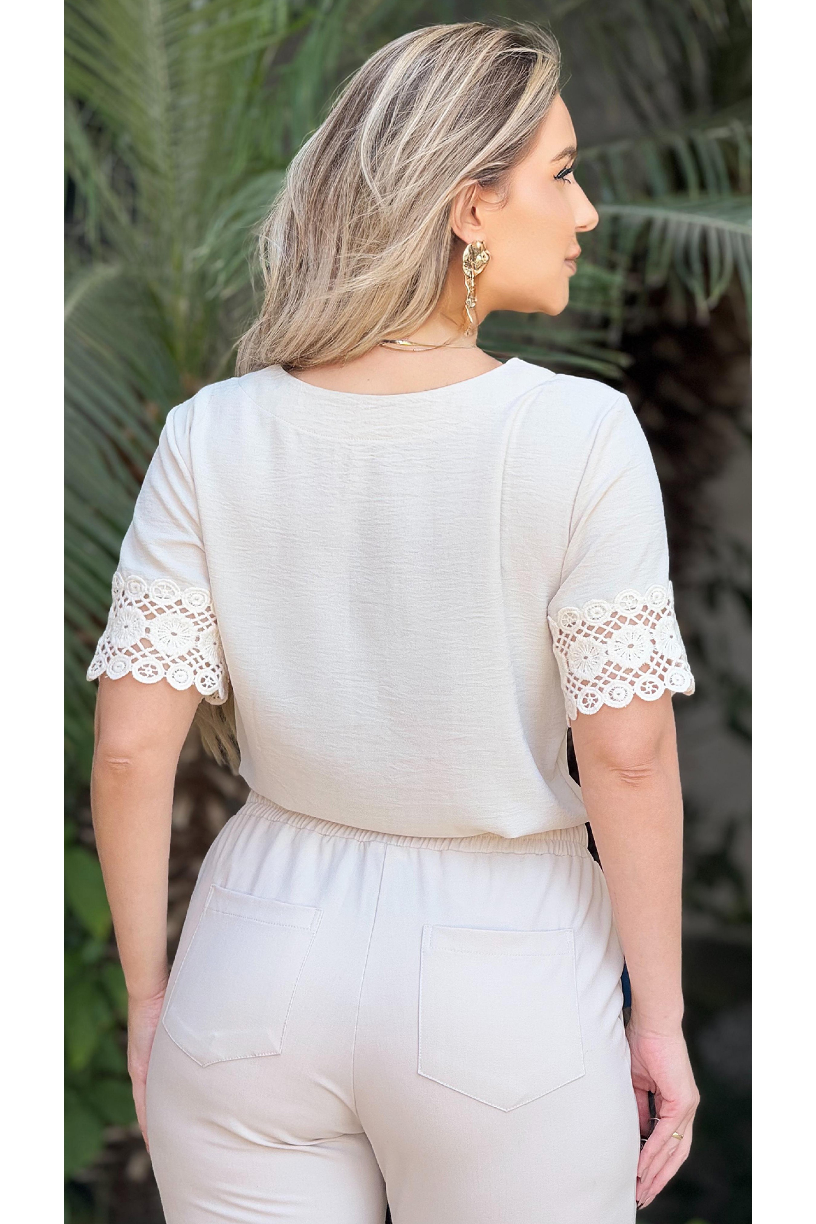 Blusa manga curta decote V com mangas em detalhes de renda de algodão. Peça toda confeccionada em tecido e extremo conforto e um excelente caimento.