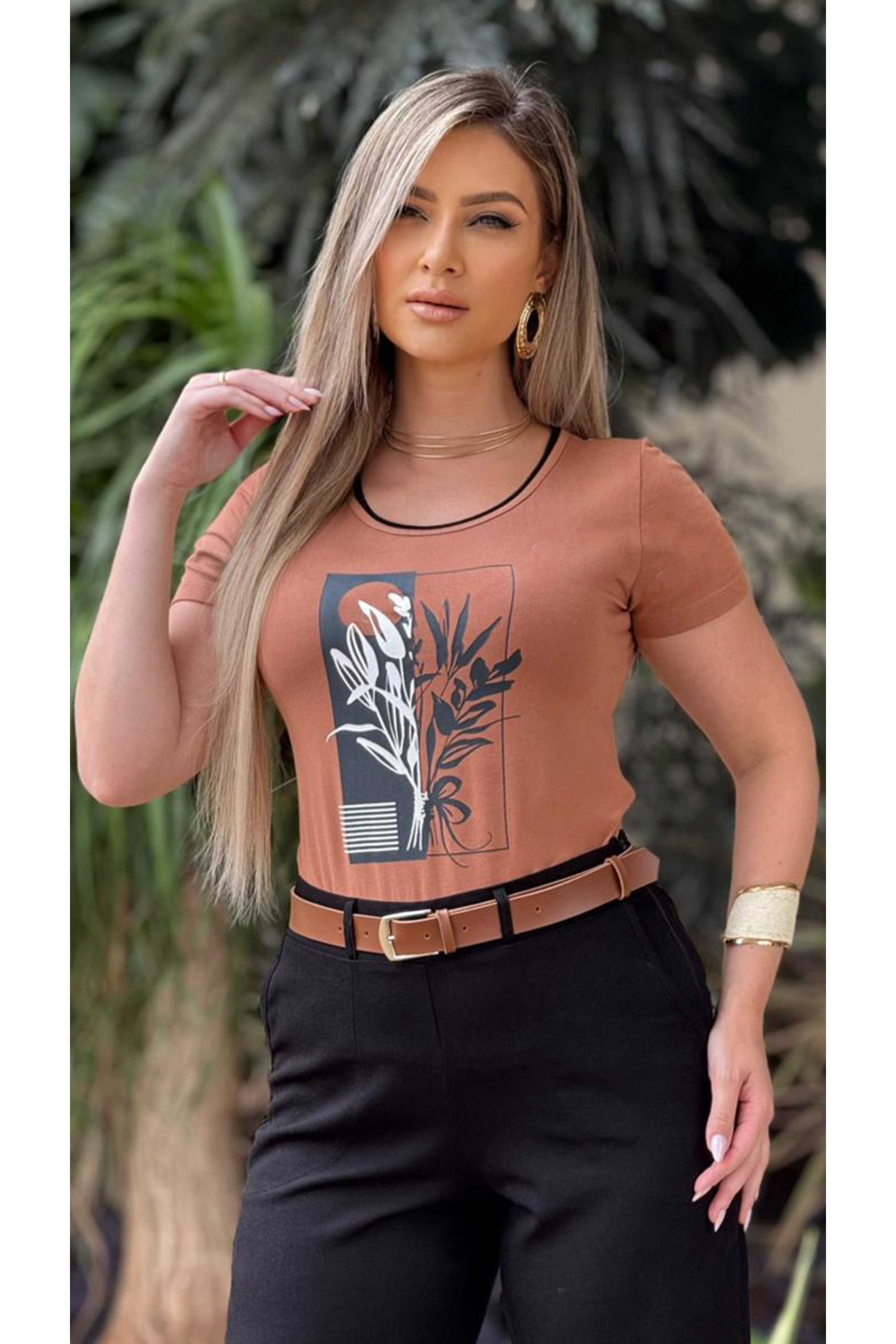 Blusa manga curta lisa com estampa em silk. Decote redondo com tira dupla. Peça toda confeccionada em malha e extremo conforto e um excelente caimento.