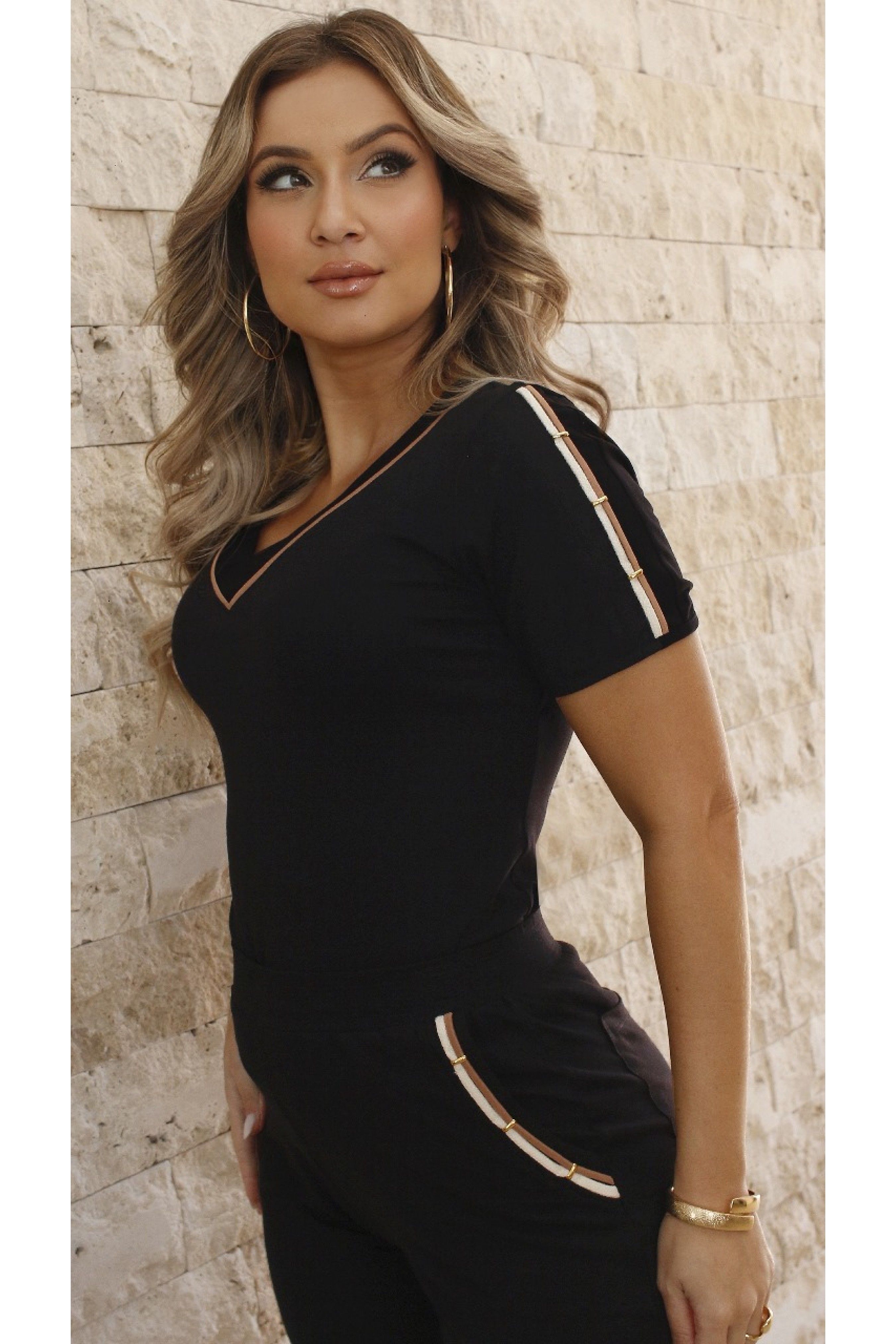 Conjunto Ramany com blusa e shorts. Blusa decote V com detalhe de vivo e mangas com detalhes de tiras de tecido, algodão e peças de metais. Shorts com cós duplo e elástico e forro. Bolso embutido com detalhes de tiras de tecido, algodão e peças de metais. Peça toda confeccionada em malha e extremo conforto e um excelente caimento.