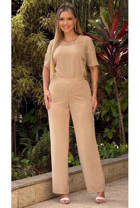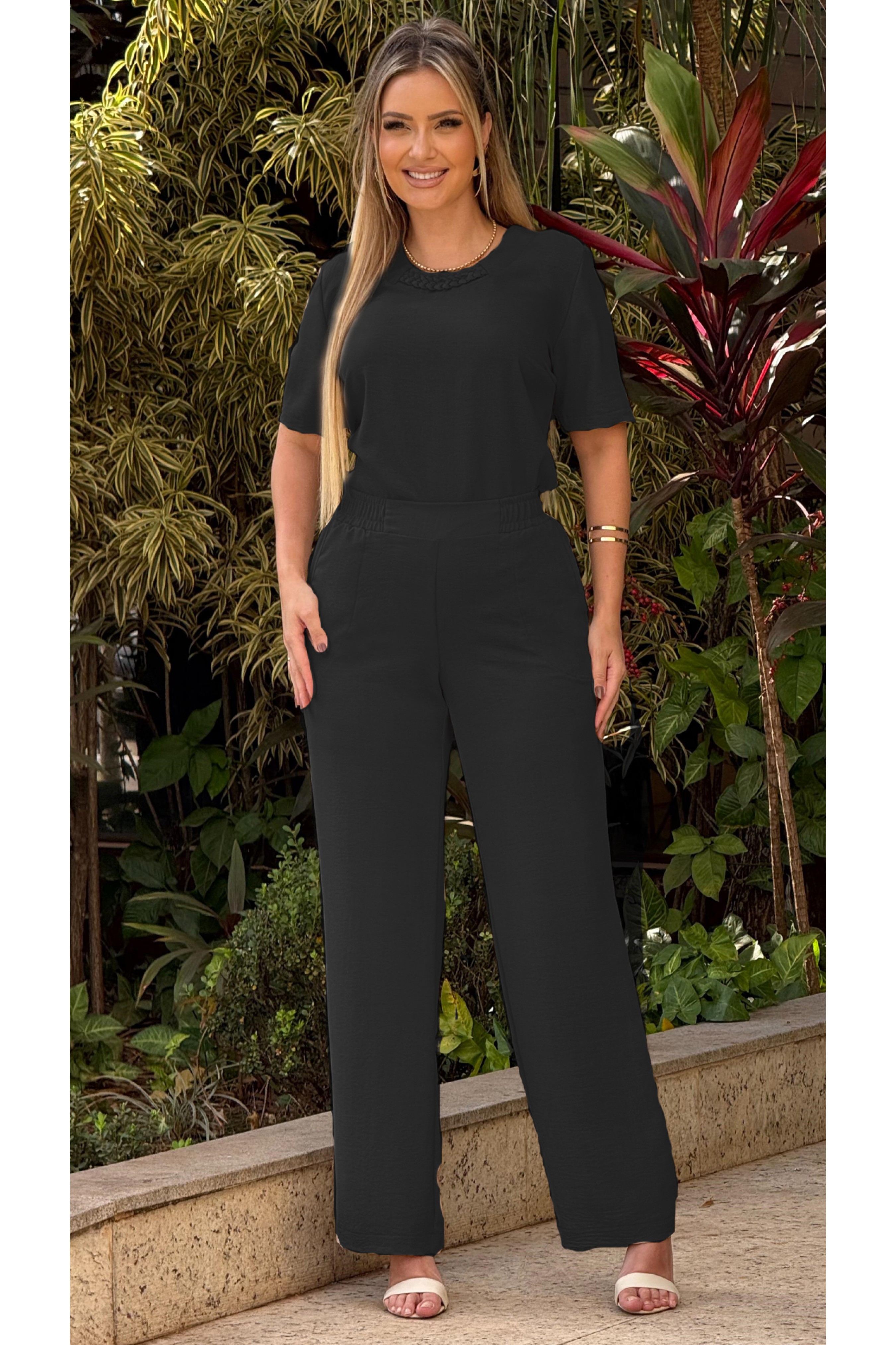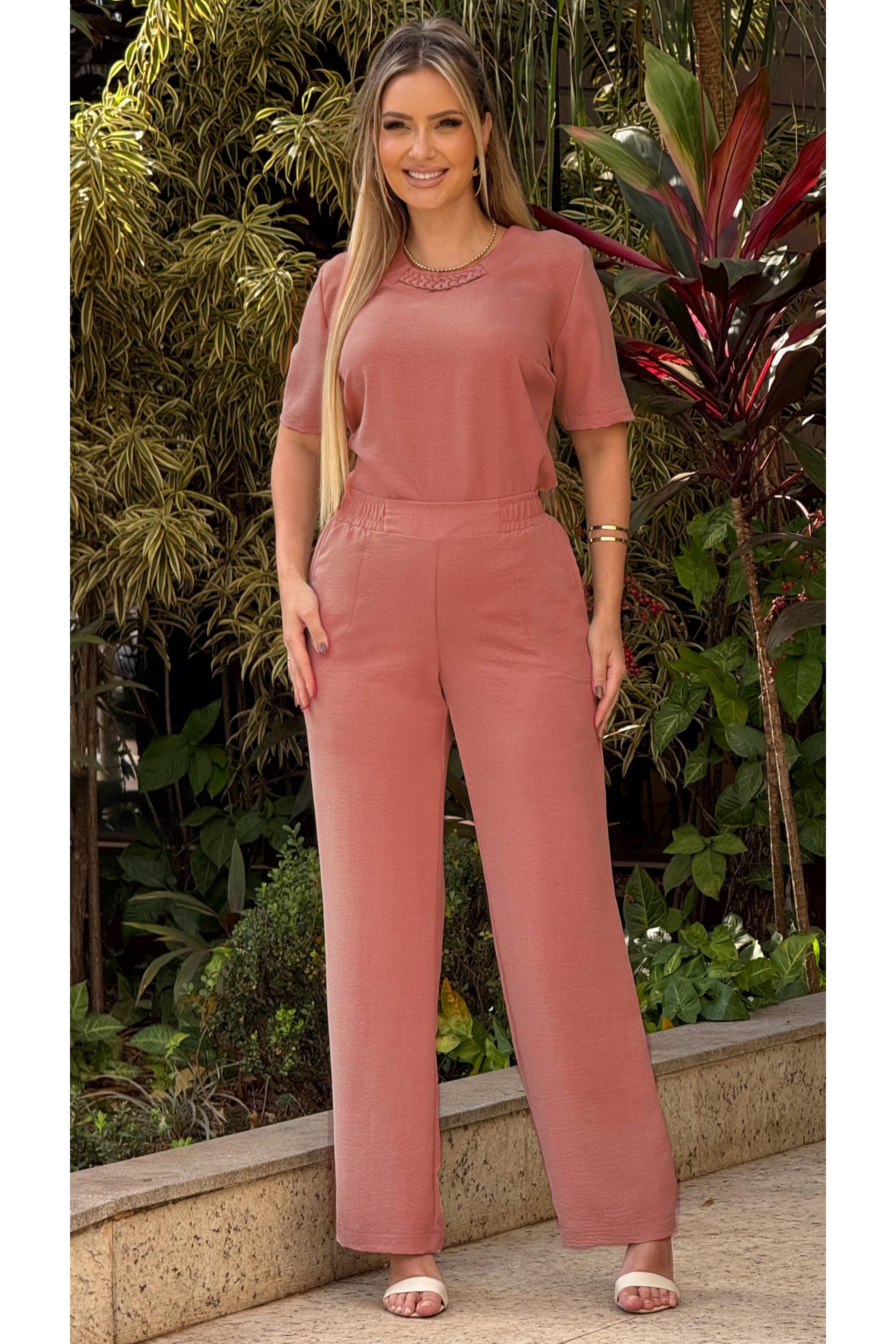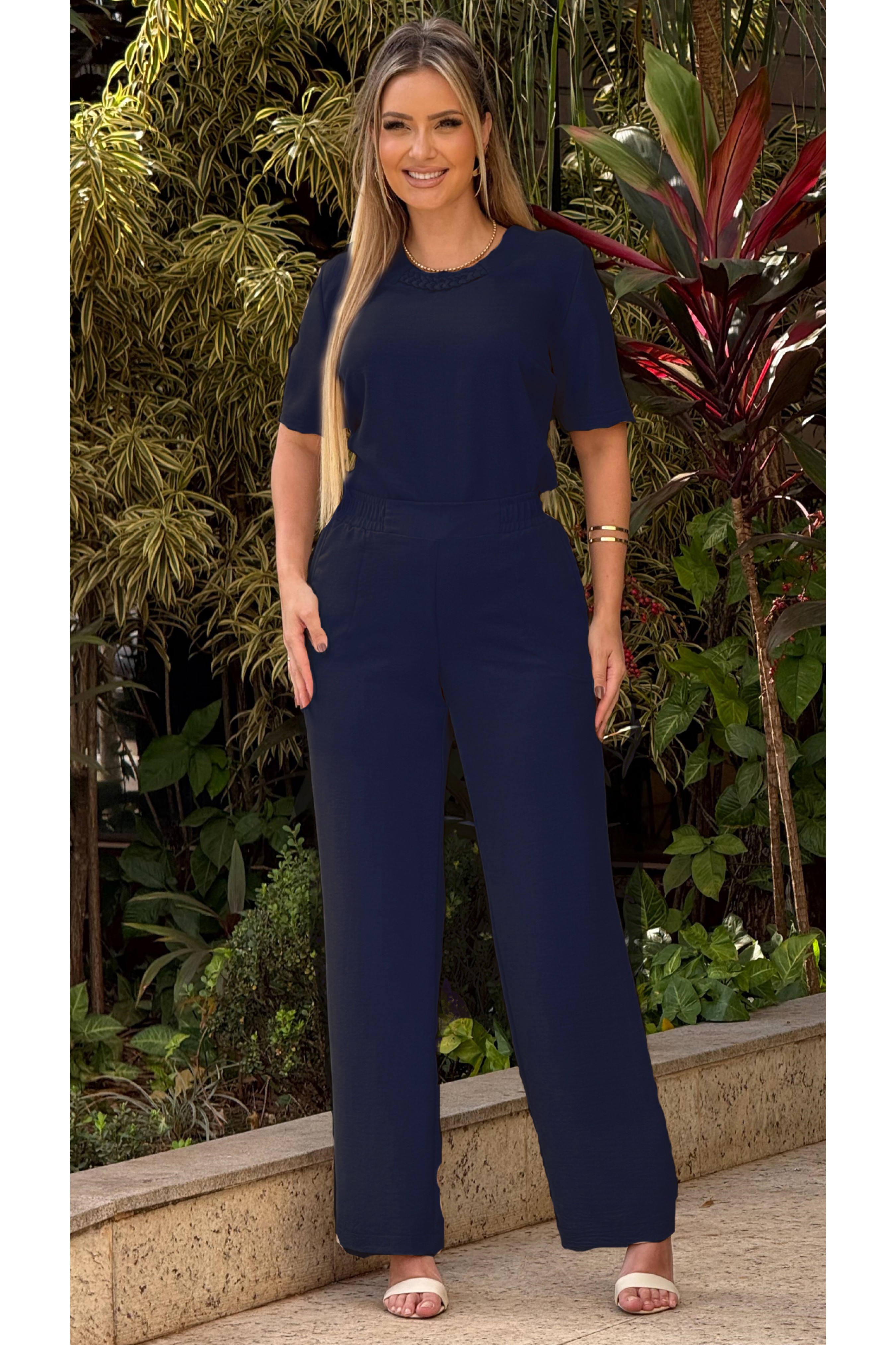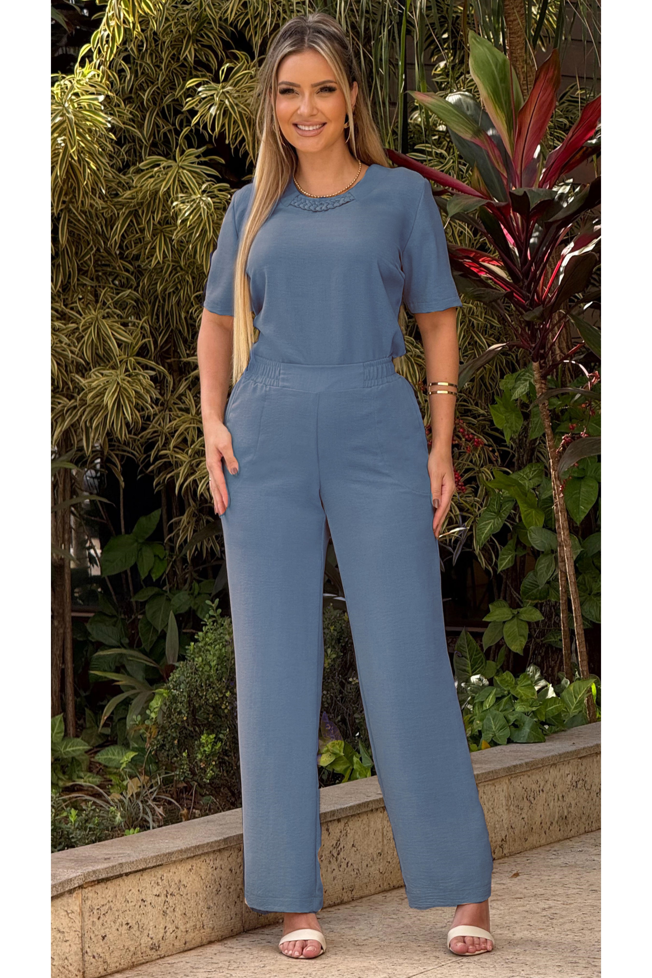Conjunto de Alfaiataria Ramany. Blusa decote redondo com recorte duplo e detalhe de trança. Calça cós com elástico e forro. Peça toda confeccionada em tecido de extremo conforto e um excelente caimento.