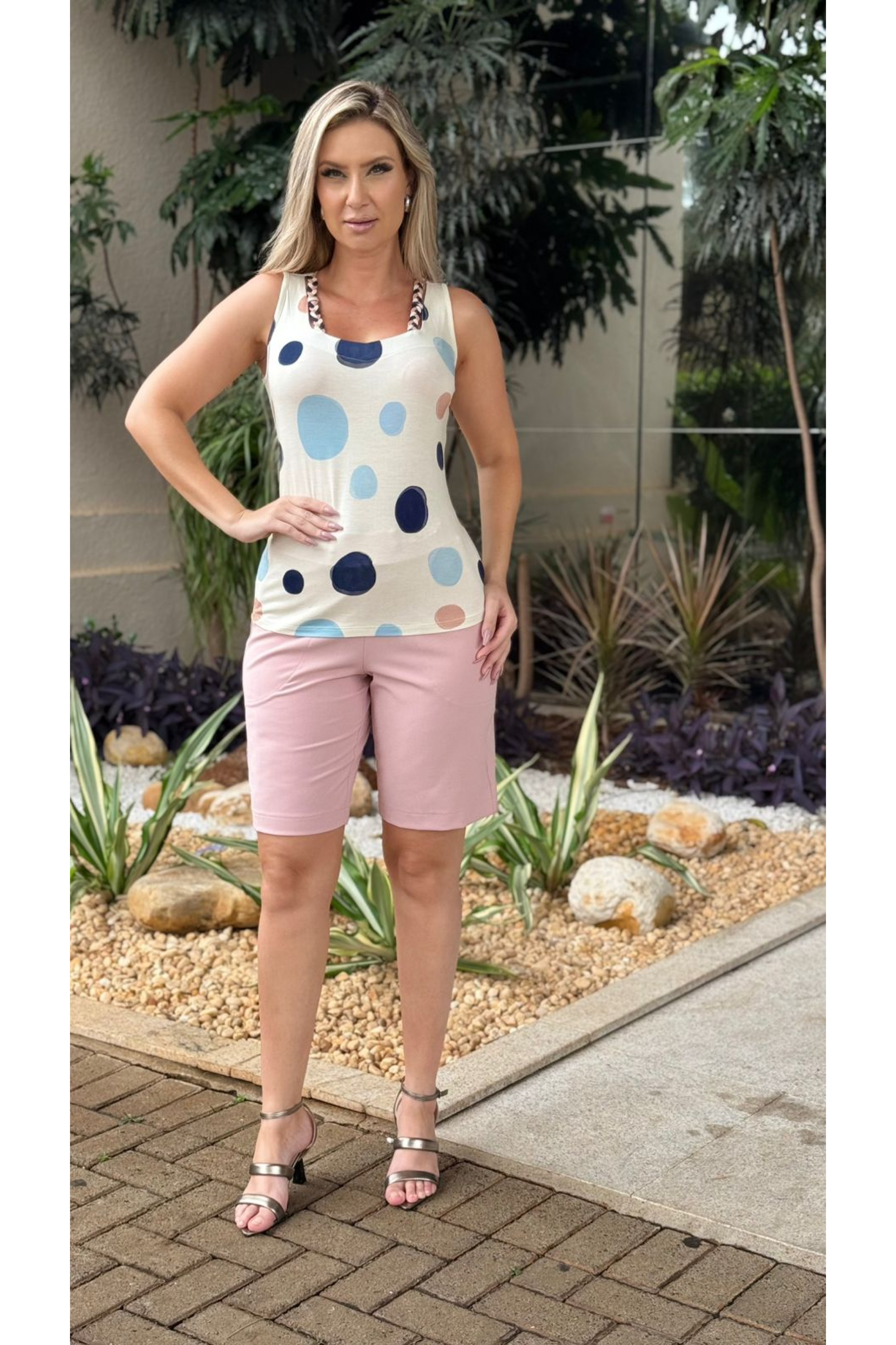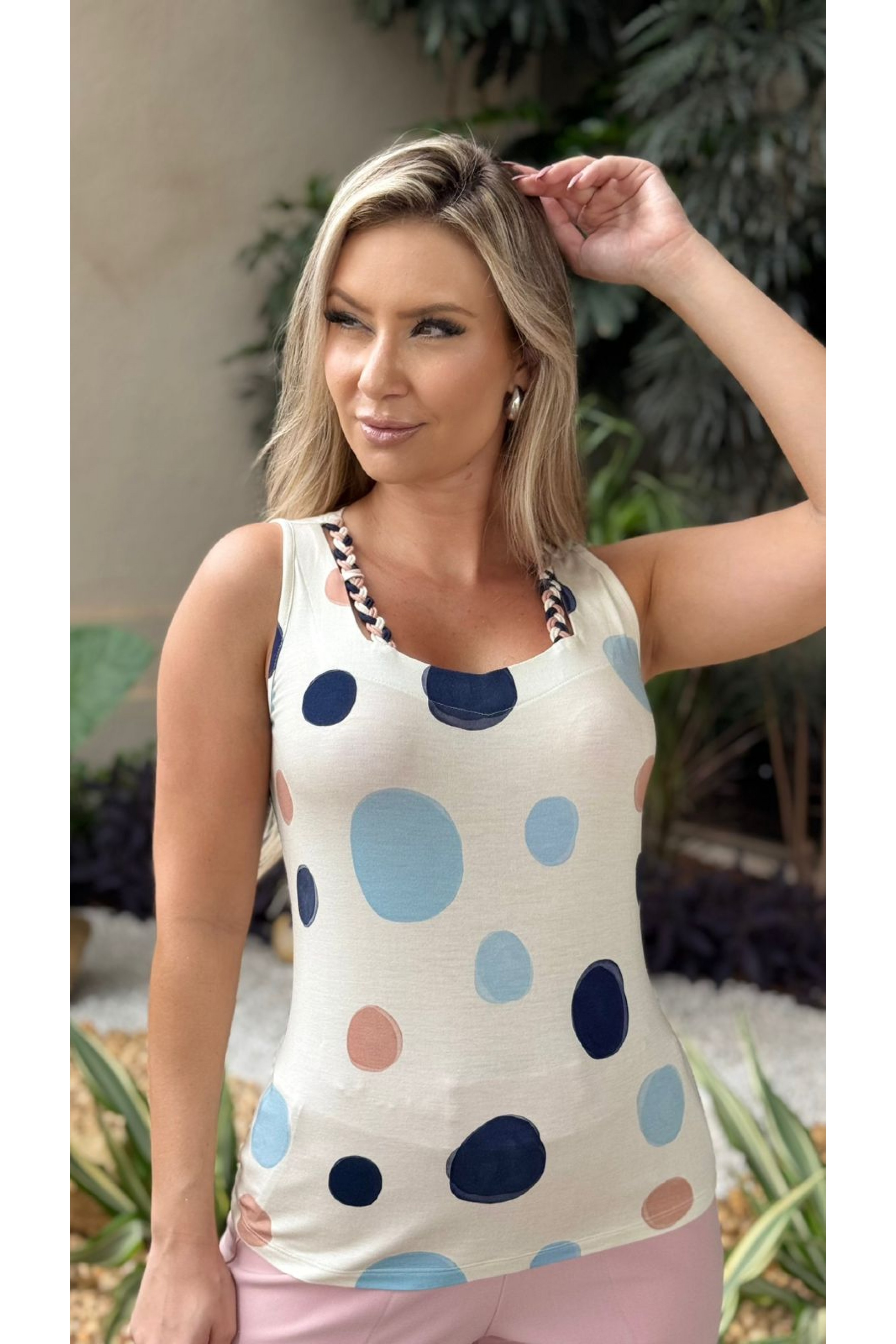 Blusa regata com estampa de poá com detalhes em tiras de tecido no decote. Peça toda confeccionada em malha e extremo conforto e um excelente caimento.