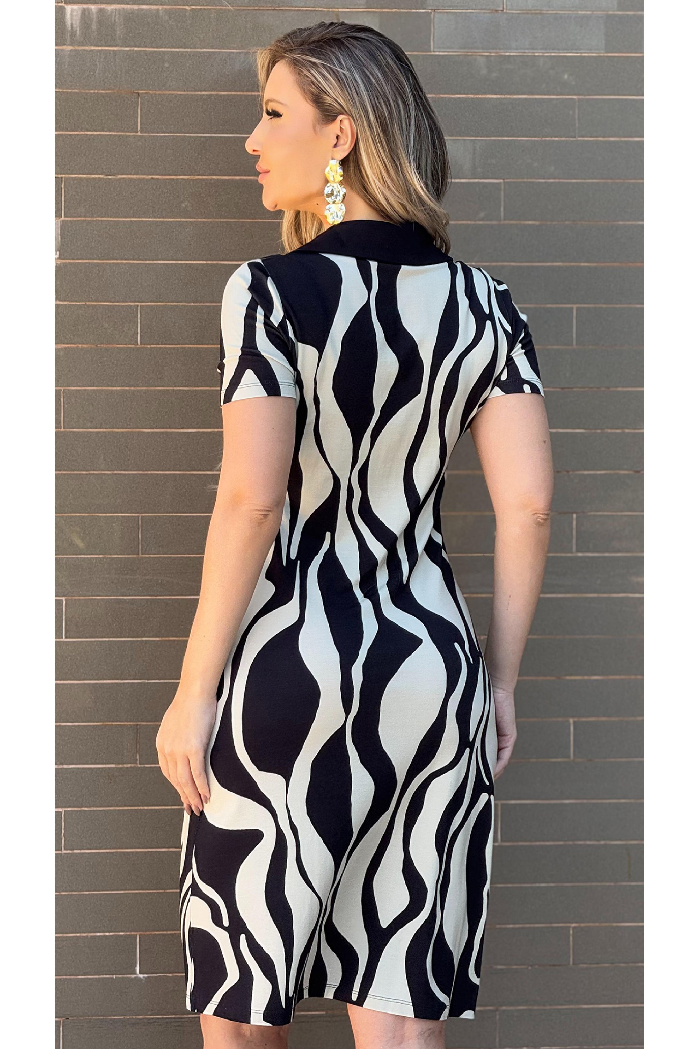 Vestido manga curta com estampa abstrata com gola polo. Peça toda confeccionada em malha que possui extremo conforto e um excelente caimento.