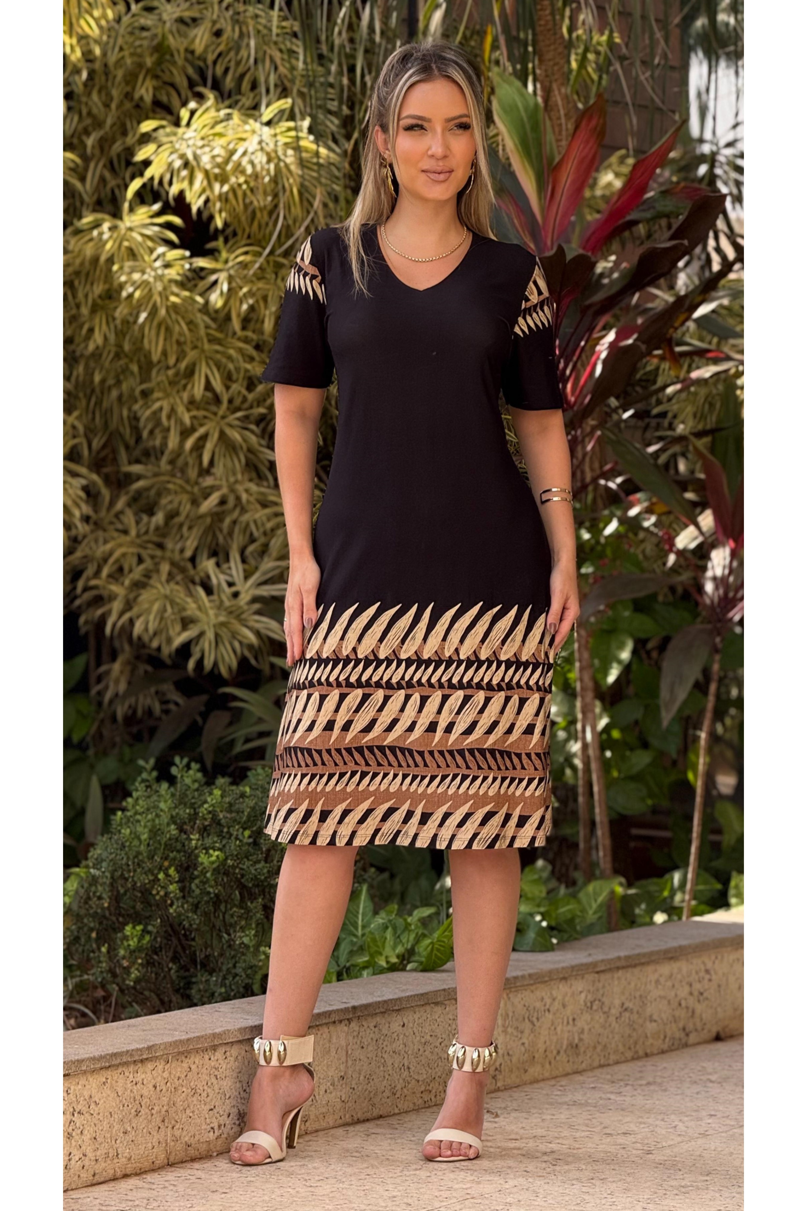 Vestido manga curta com estampa barrada exclusiva Ramany. Decote V com detalhe de vivo. Peça toda confeccionada em malha  que possui extremo conforto e um excelente caimento.
