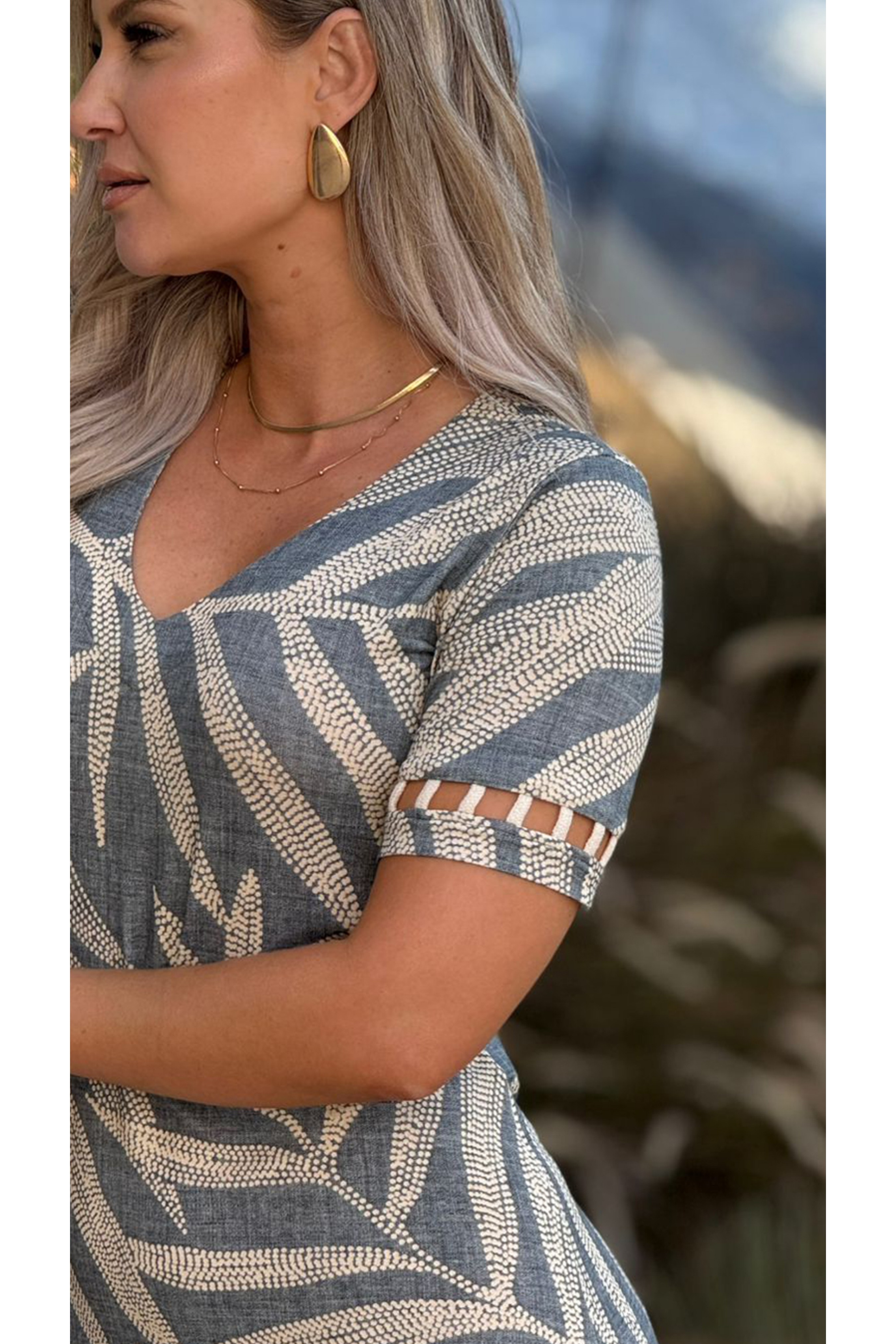 Vestido manga curta com estampa de folhagem exclusiva Ramany. Decote V. Mangas com recorte duplo e detalhes de tiras de algodão. Peça toda confeccionada em malha que possui extremo conforto e um excelente caimento.