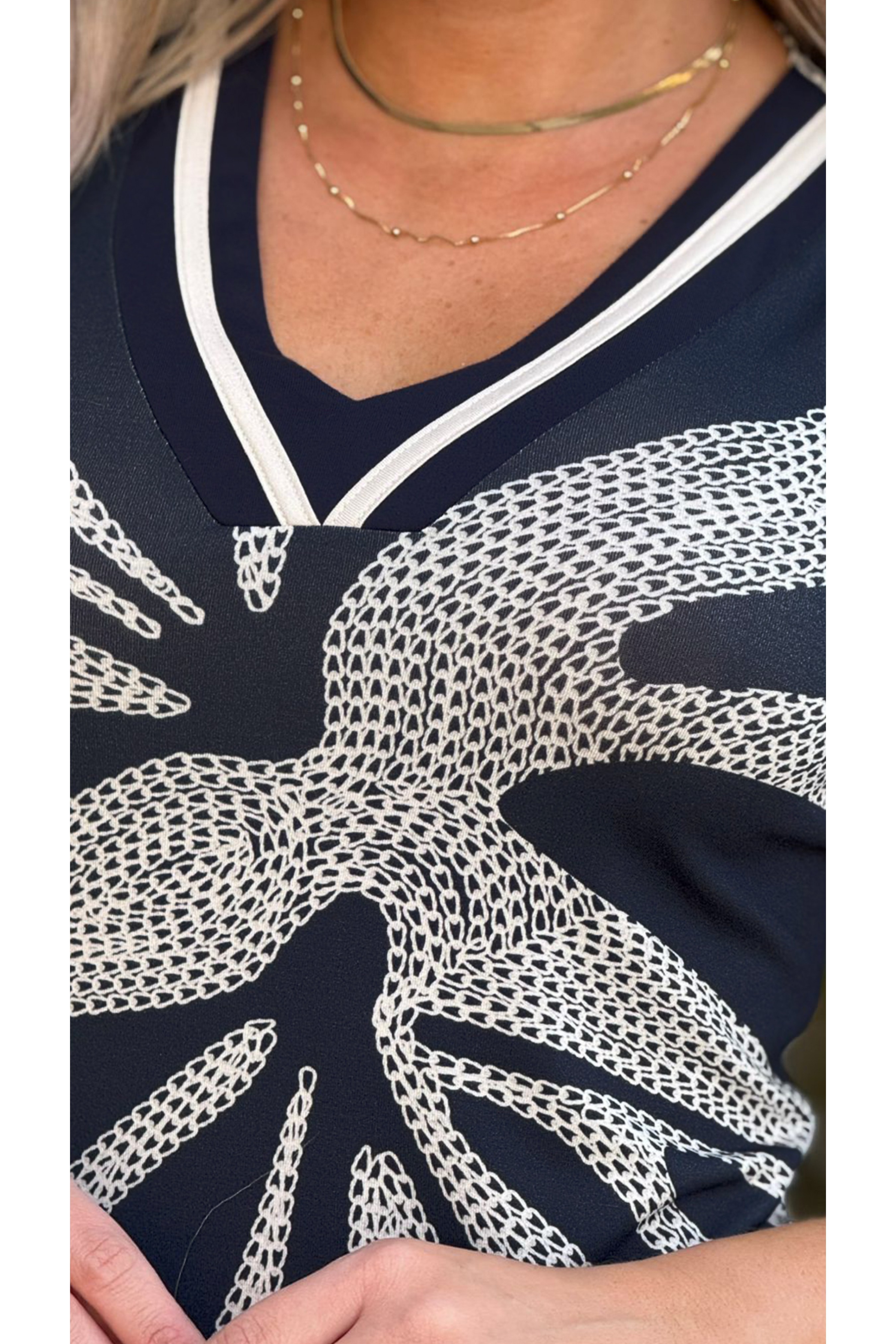 Vestido Manga curta com estampa exclusiva Ramany. Decote V com detalhes galão. Peça toda confeccionada em malha que possui extremo conforto e um excelente caimento.