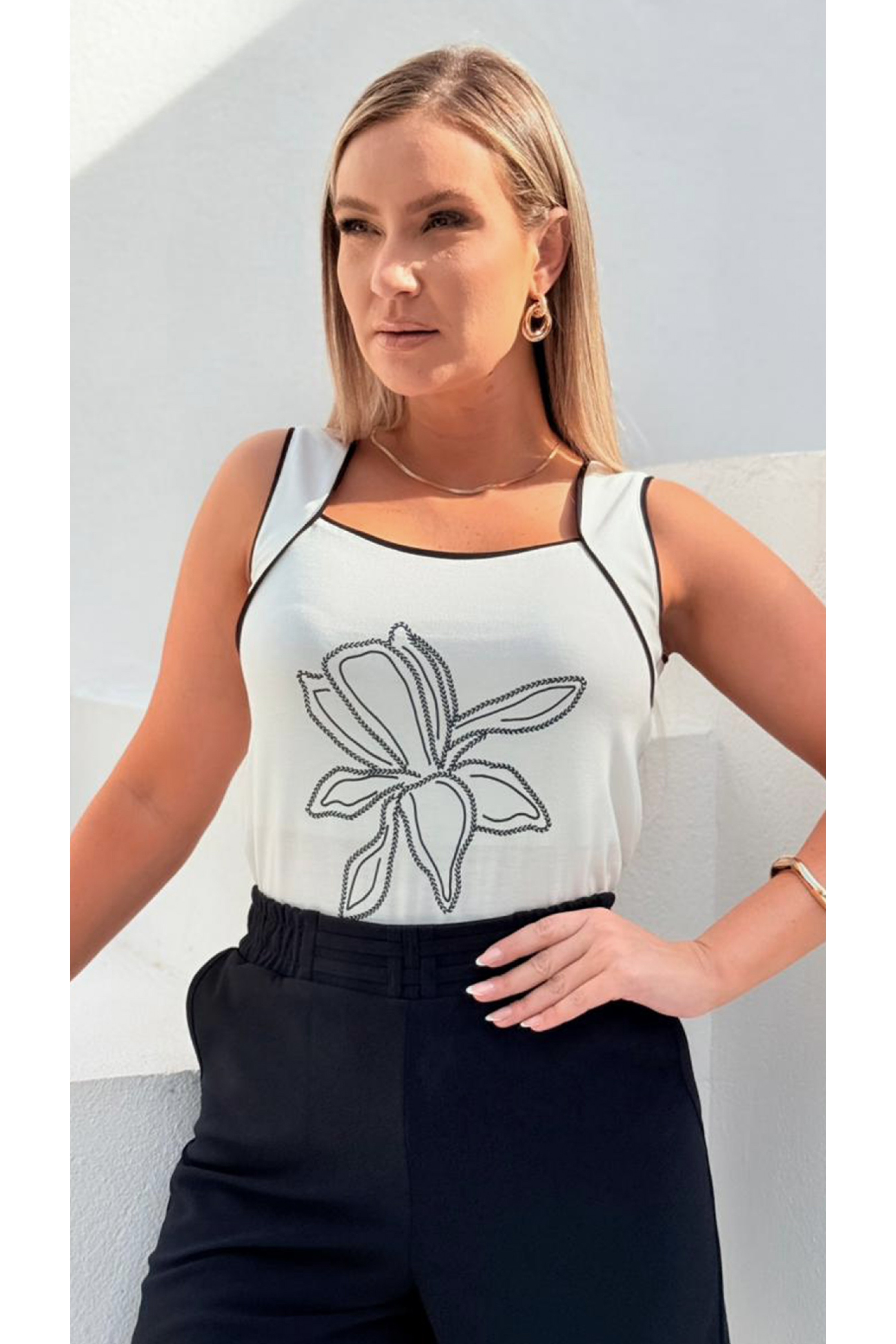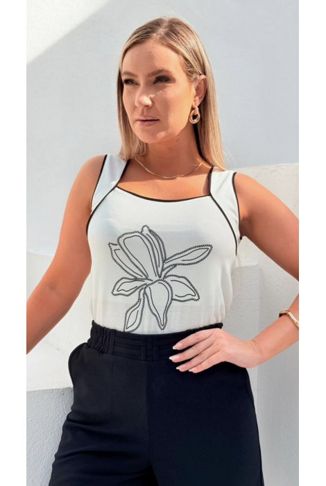 Blusa regata lisa com estampa em silk. decote nadador com recorte duplo nas cavas e detalhes de debrum. Contém forro do mesmo tecido na frente. Peça toda confeccionada em malha e extremo conforto e um excelente caimento.