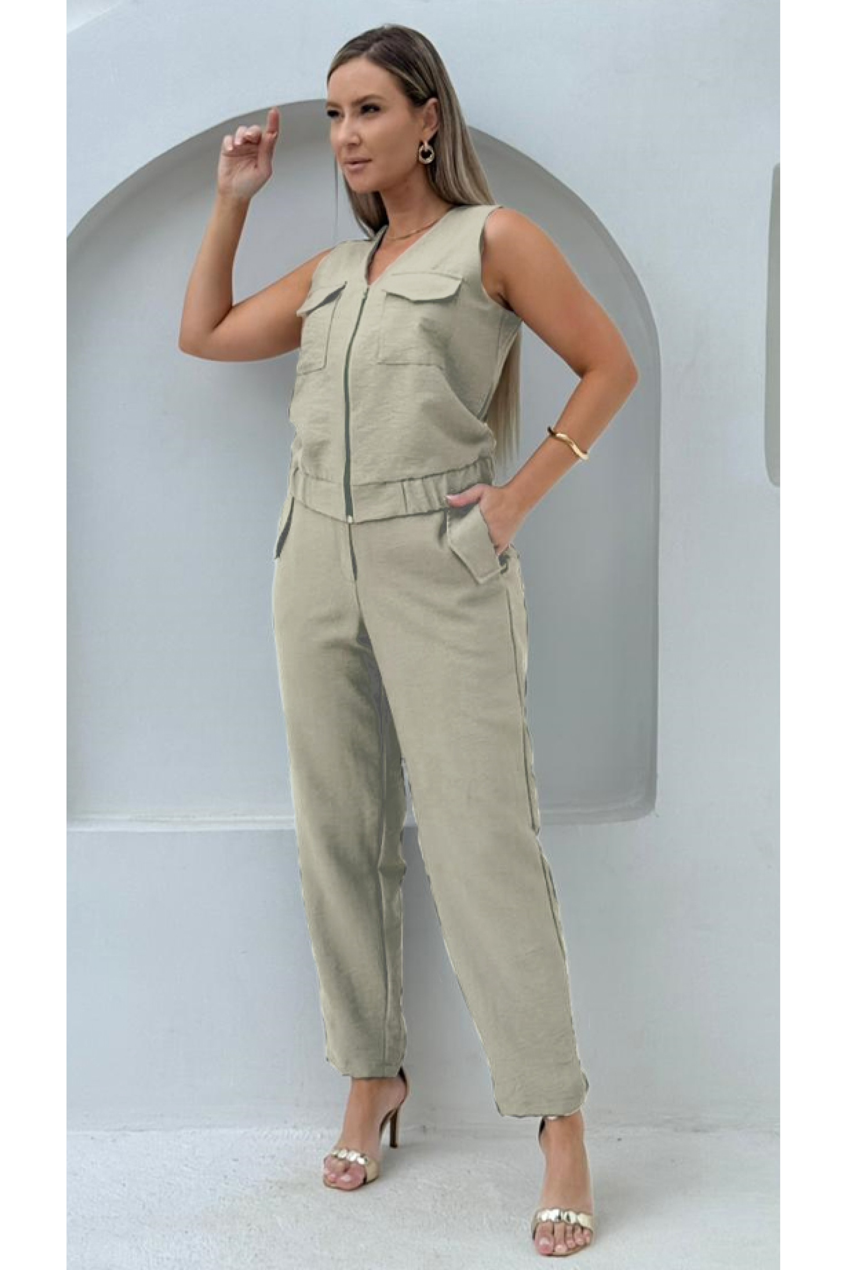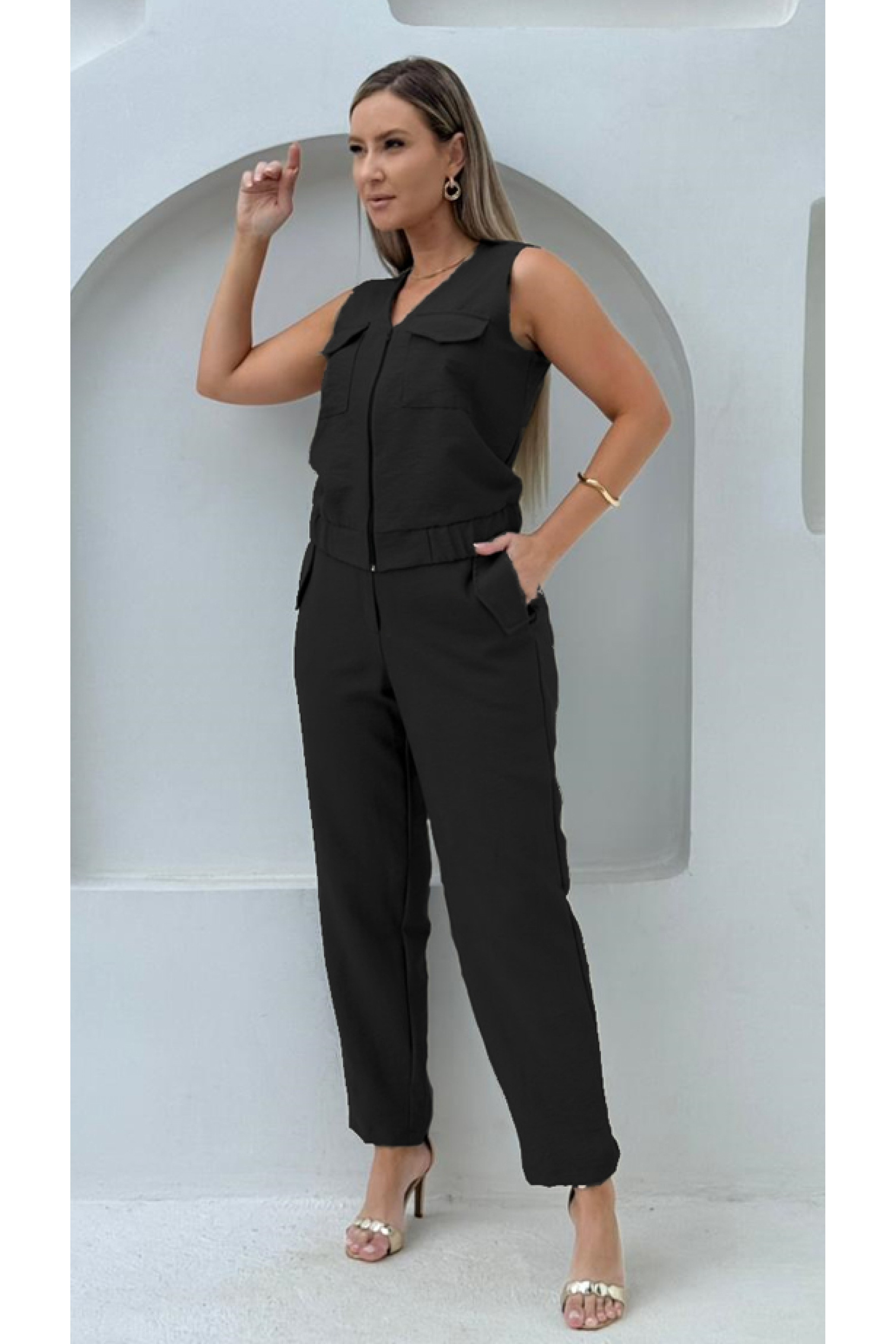 Conjunto de Alfaiataria Ramany. Colete com zíper na frente, bolso com lapela. Calça com bolso embutido na frente com lapela. Cós com elástico nas contas. Peça toda confeccionada em tecido de extremo conforto e um excelente caimento.