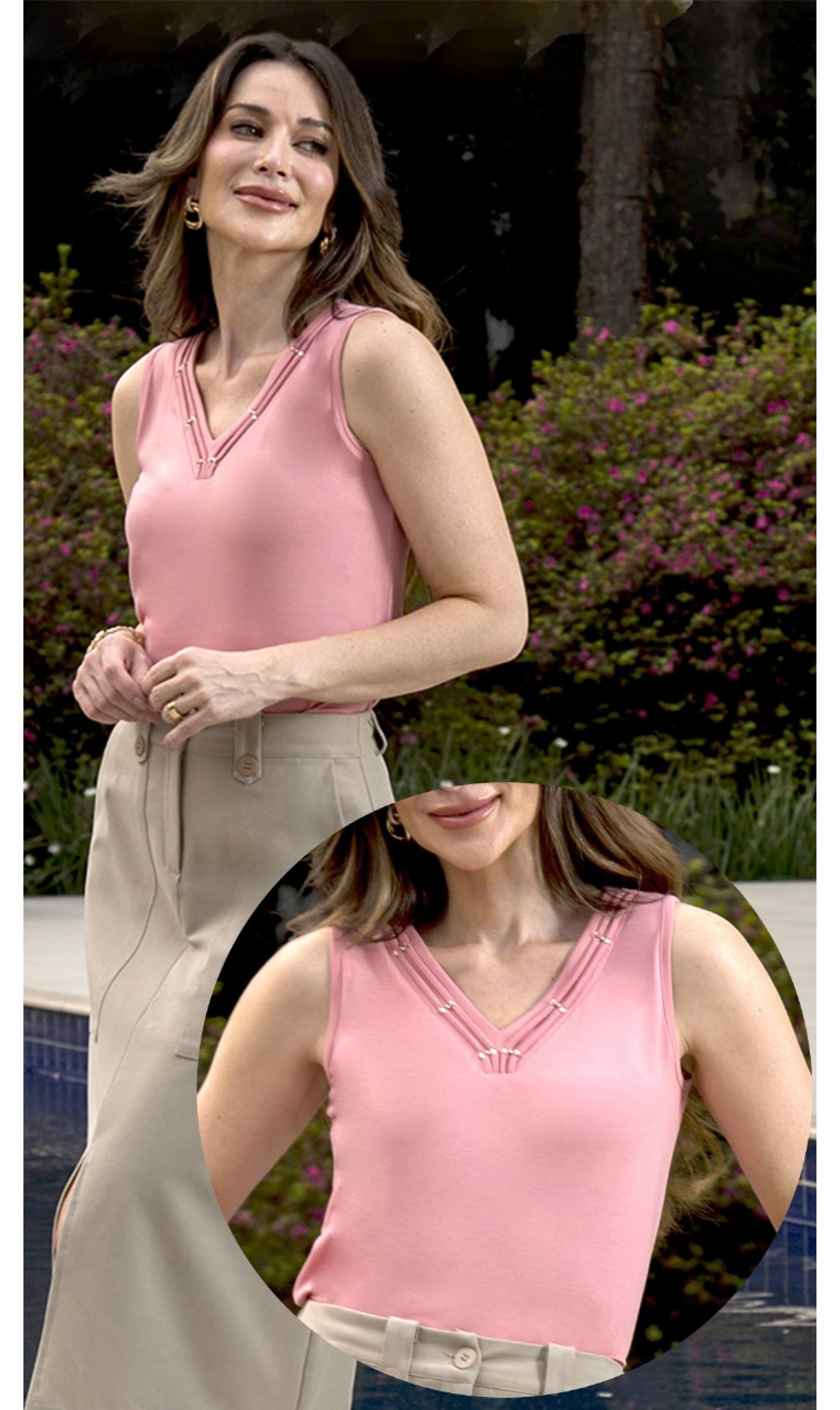 Blusa regata no decote V com aplicação de tiras e bordado . Peça toda confeccionada em malha e extremo conforto e um excelente caimento.