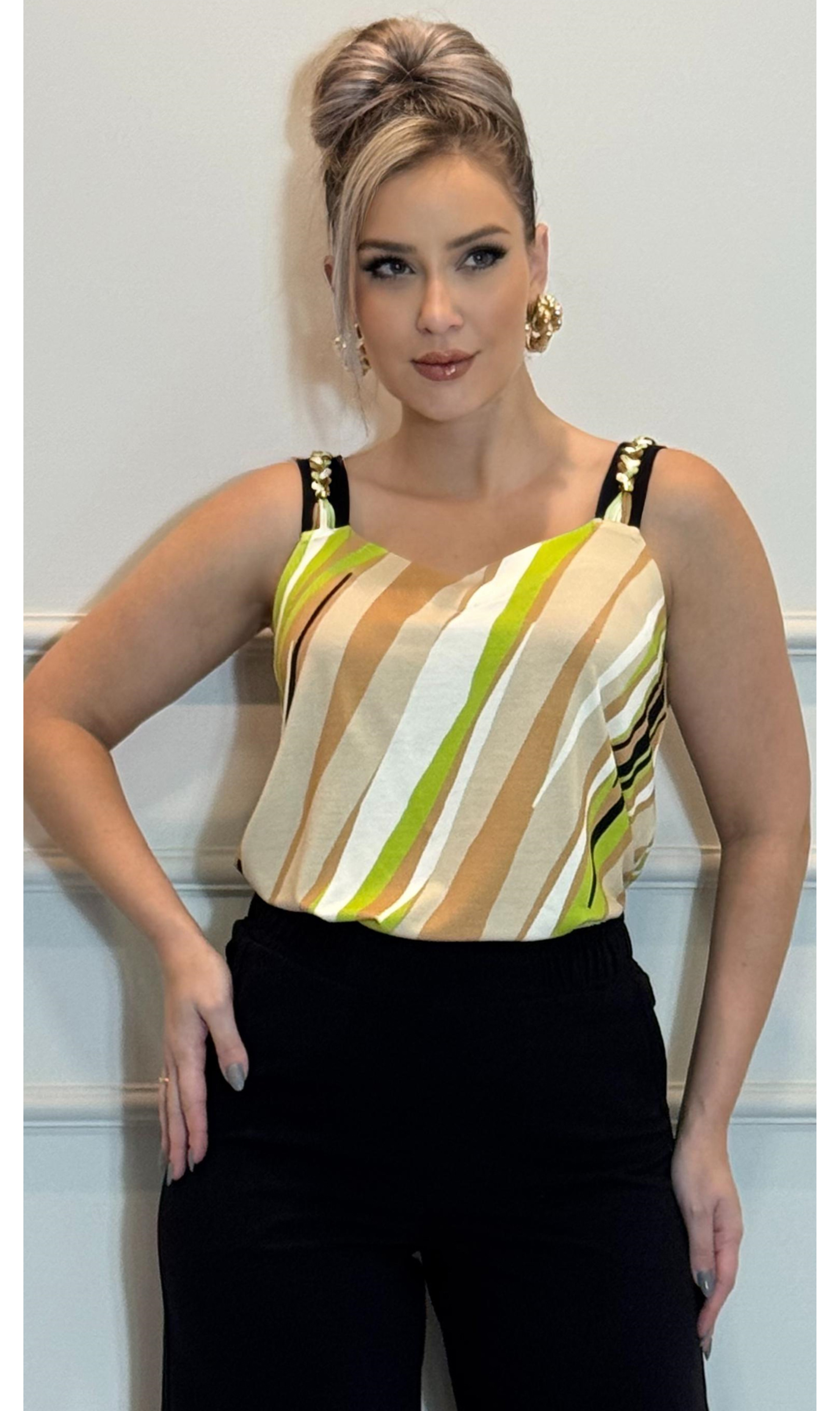 Blusa regata estampada com detalhes em cordão de algodão traçados nas alças. Peça toda confeccionada em malha e extremo conforto e um excelente caimento.