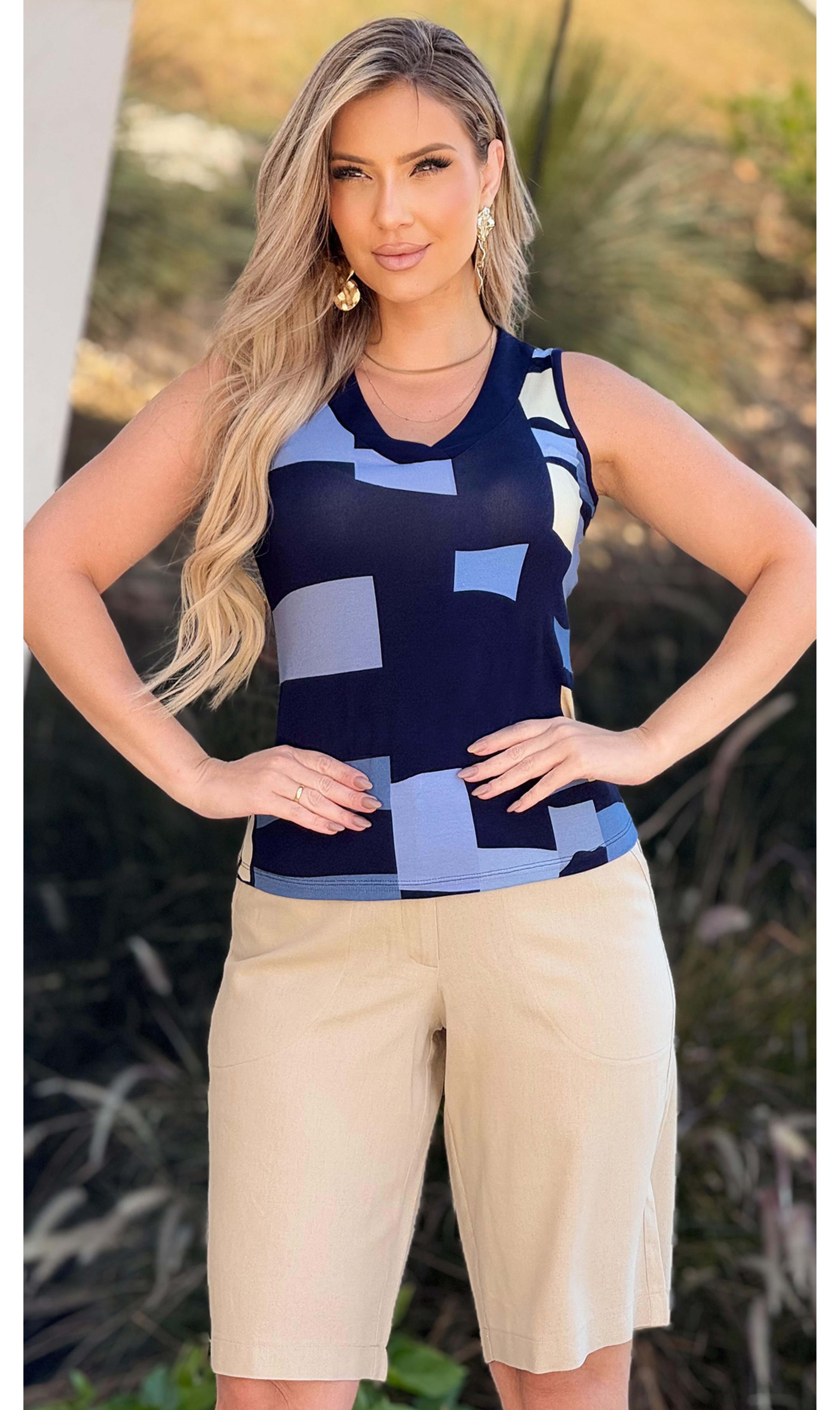 Blusa regata com estampa geométrica exclusiva Ramany. Decote V em tecido liso Azul. Peça toda confeccionada em malha e extremo conforto e um excelente caimento.