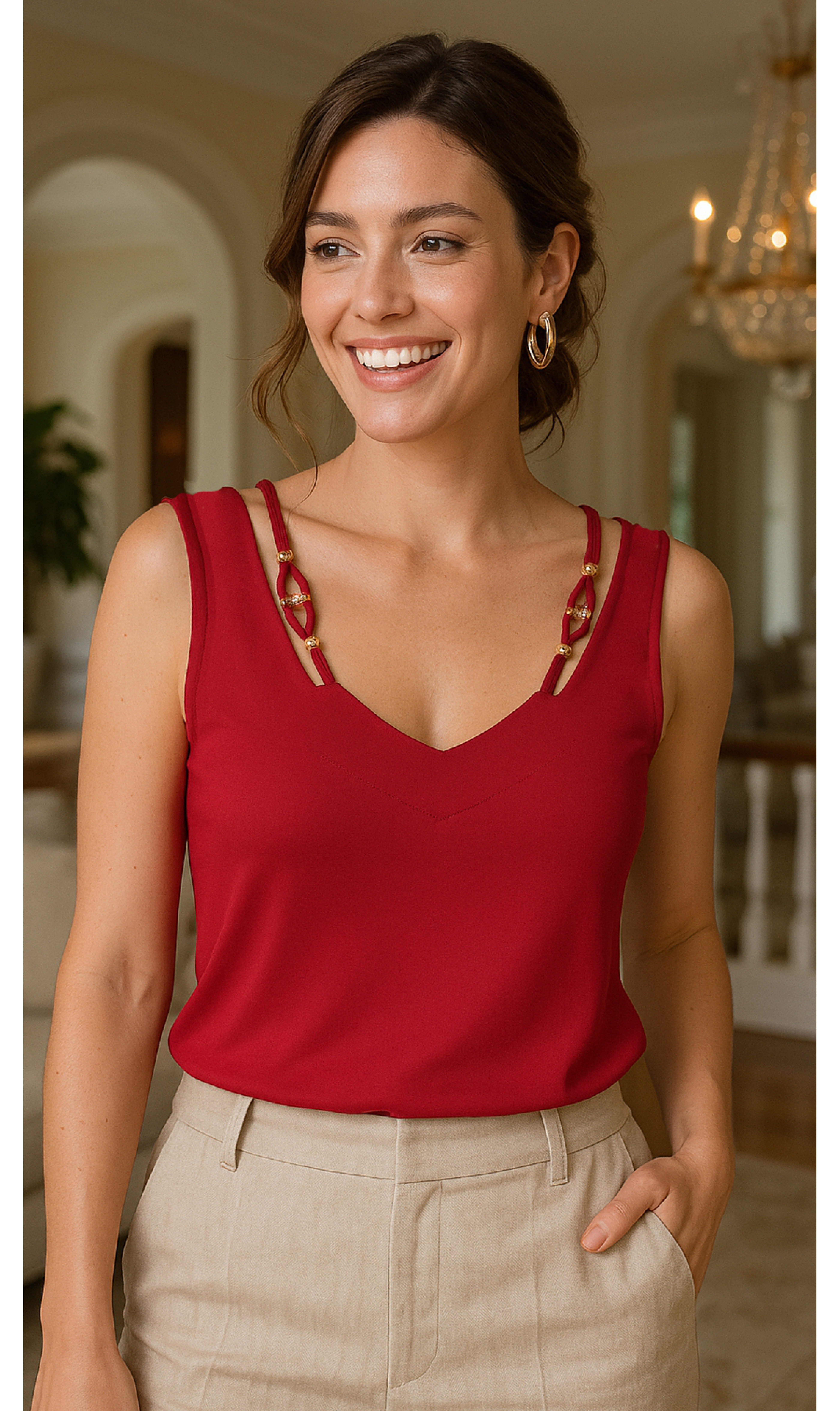 Blusa regata lisa, decote V com detalhes de tirinhas e peças de acrílico. Peça toda confeccionada em malha e extremo conforto e um excelente caimento.