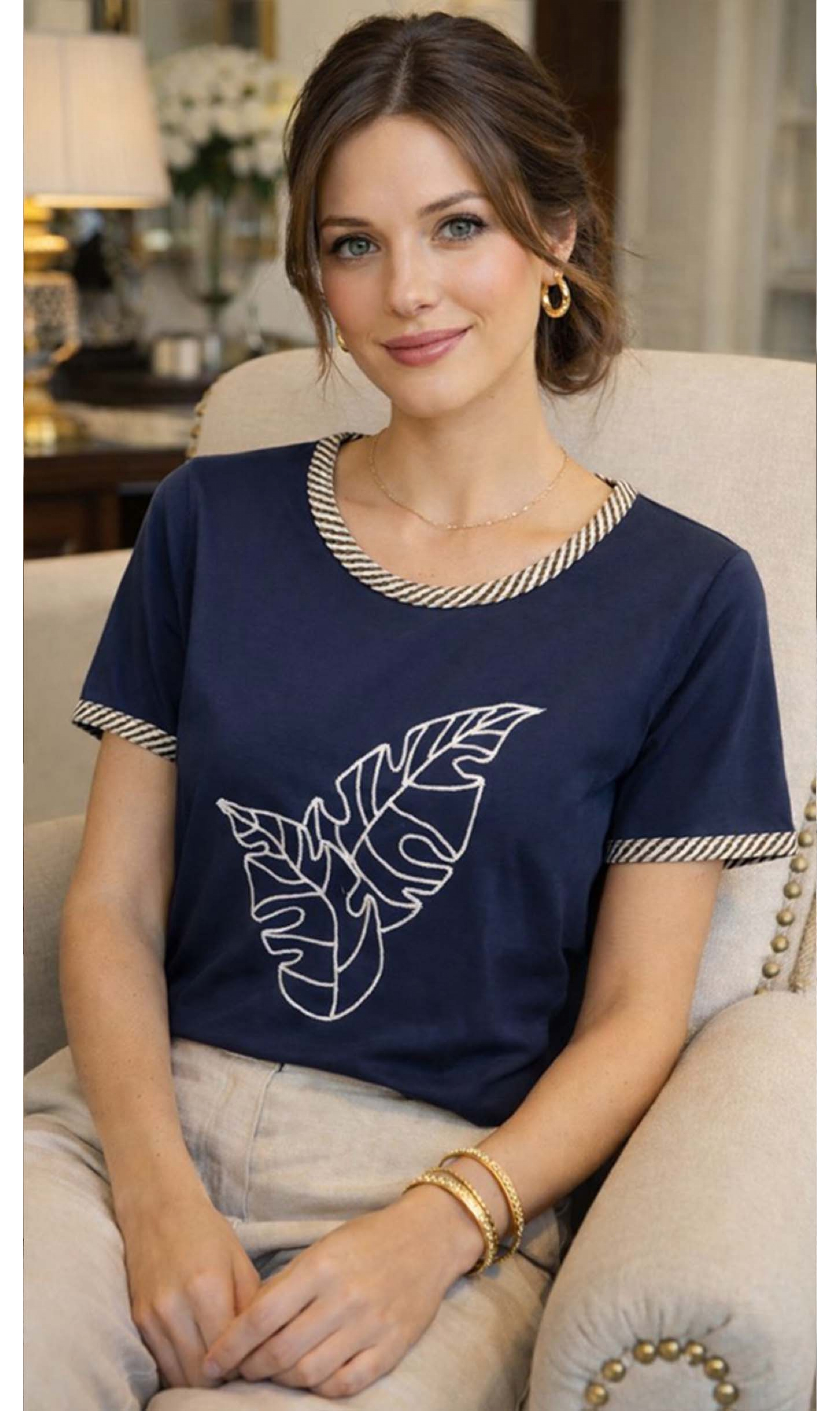 Blusa manga curta lisa com estampa em silk, que traz modernidade e personalidade ao visual. O decote redondo garante versatilidade, enquanto os detalhes em cordão de algodão nas mangas e no decote agregam charme e acabamento diferenciado à peça.