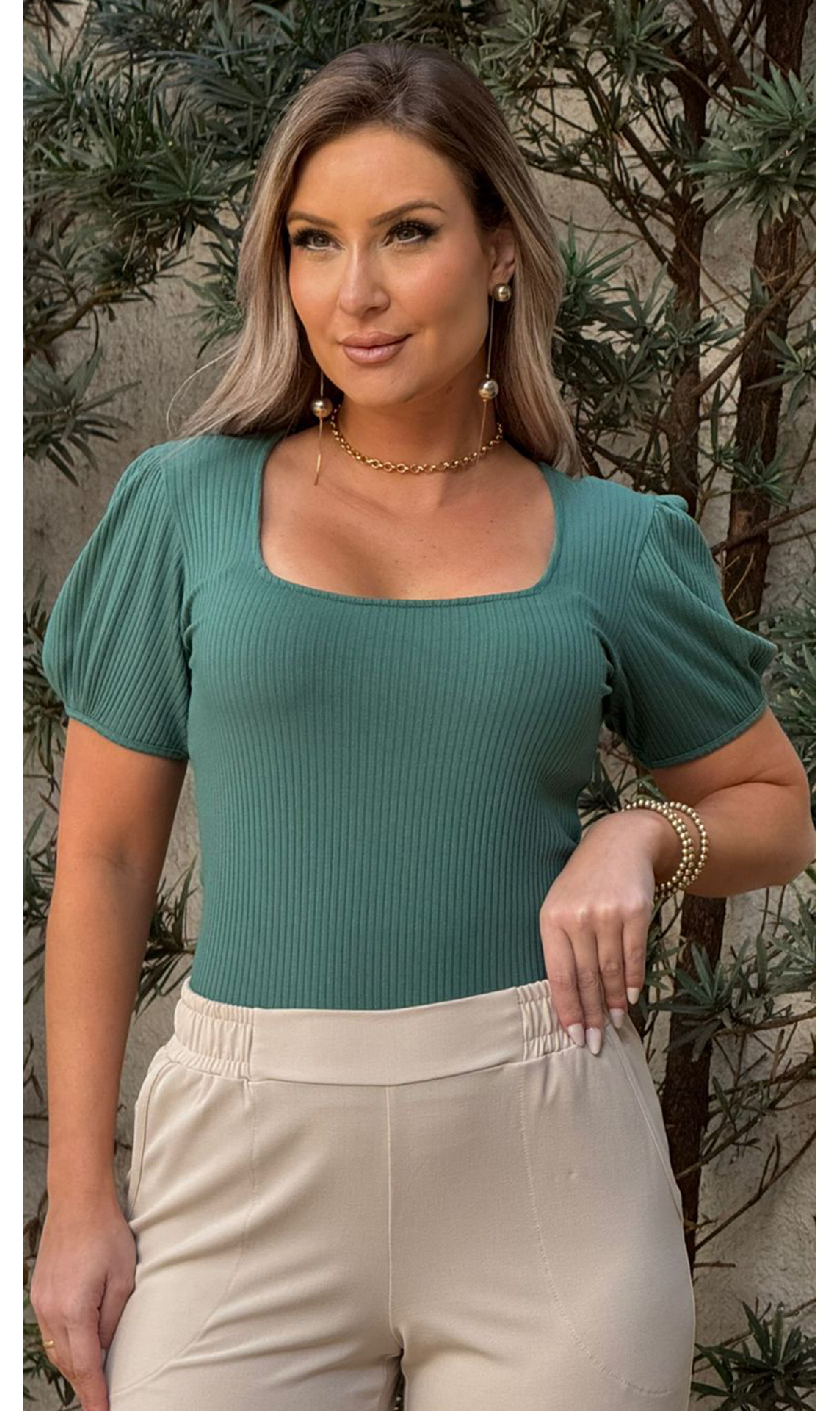 Blusa manga curta com malha canelada, decote quadrado com mangas bufantes. Peça toda confeccionada em malha e extremo conforto e um excelente caimento.