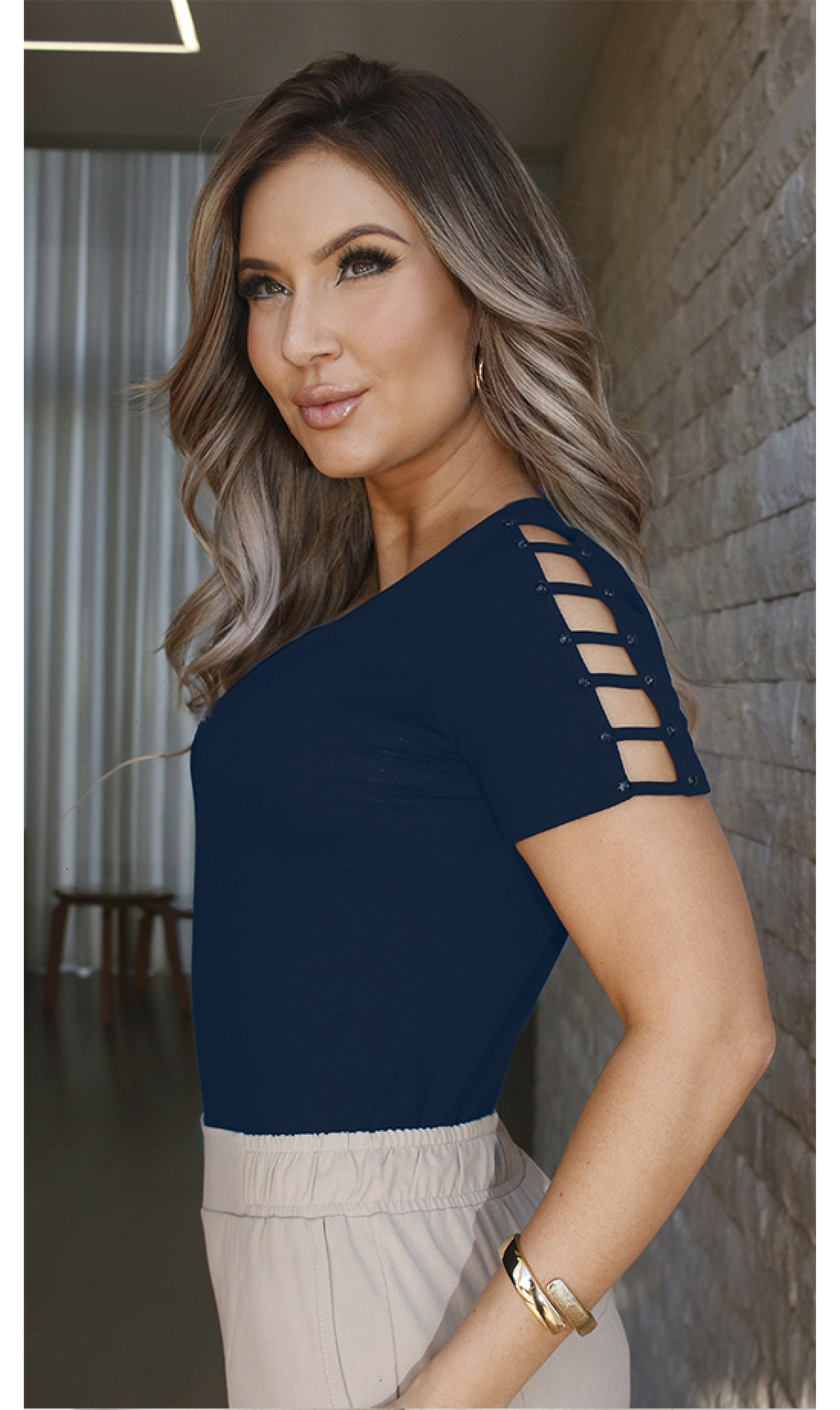 Blusa manga curta decote V com mangas em detalhes de tiras e bordados. Peça toda confeccionada em malha de extremo conforto e um excelente caimento.