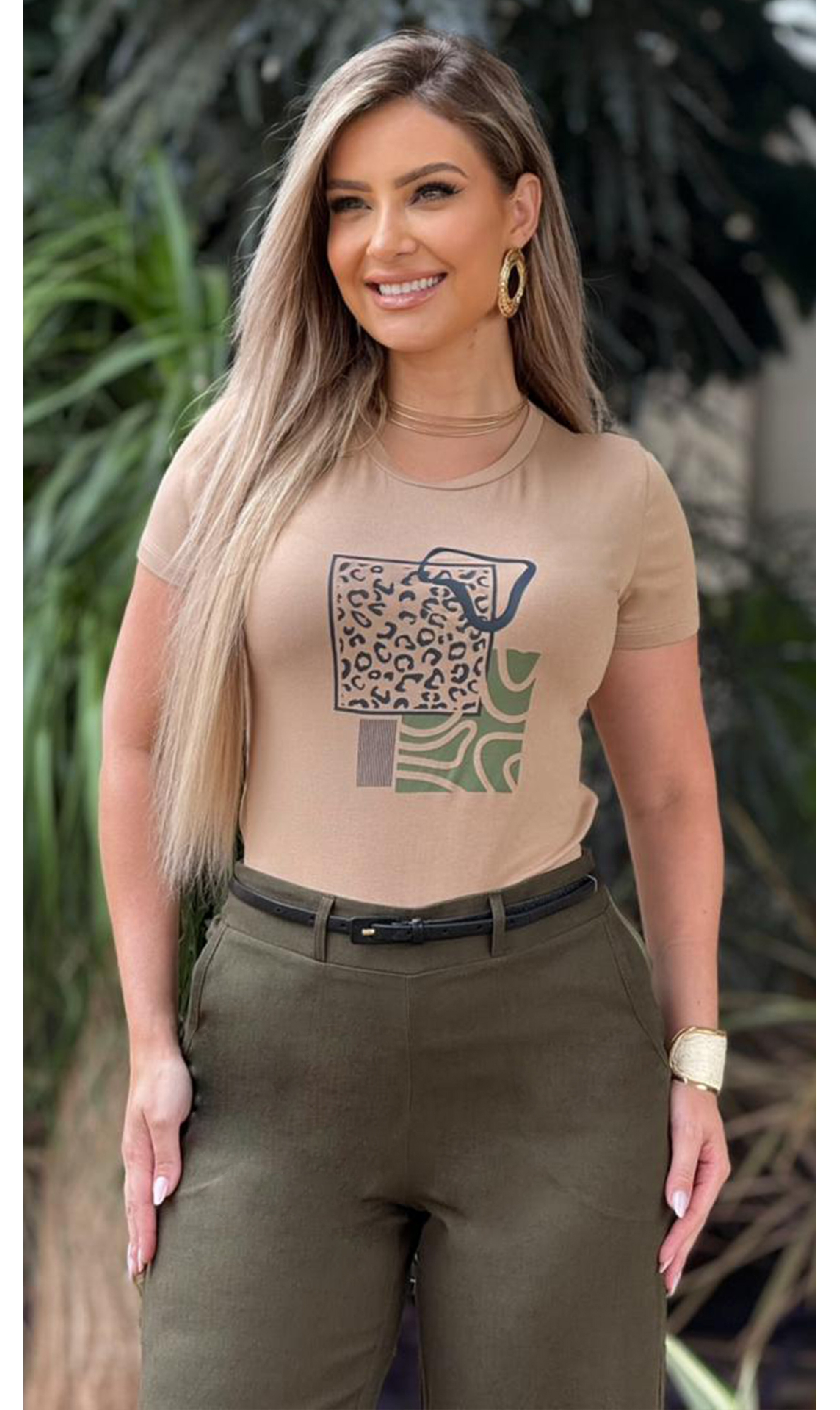 Blusa manga curta lisa com estampa em silk. Decote redondo com tira dupla. Peça toda confeccionada em malha e extremo conforto e um excelente caimento.