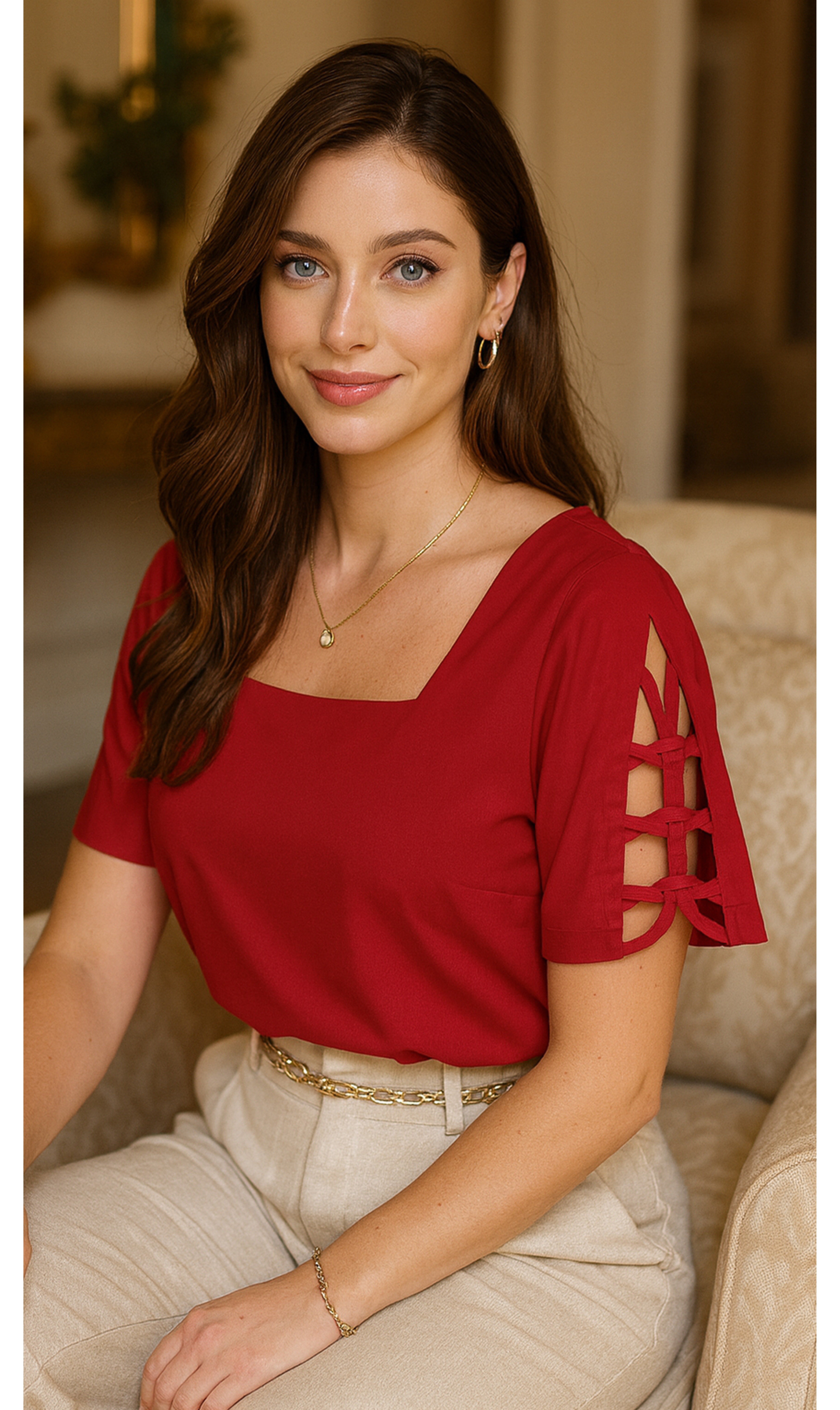 Blusa manga curta de tecido plano. Decote quadrado com detalhes de tresse nas mangas . Peça toda confeccionada em tecido e extremo conforto e um excelente caimento.