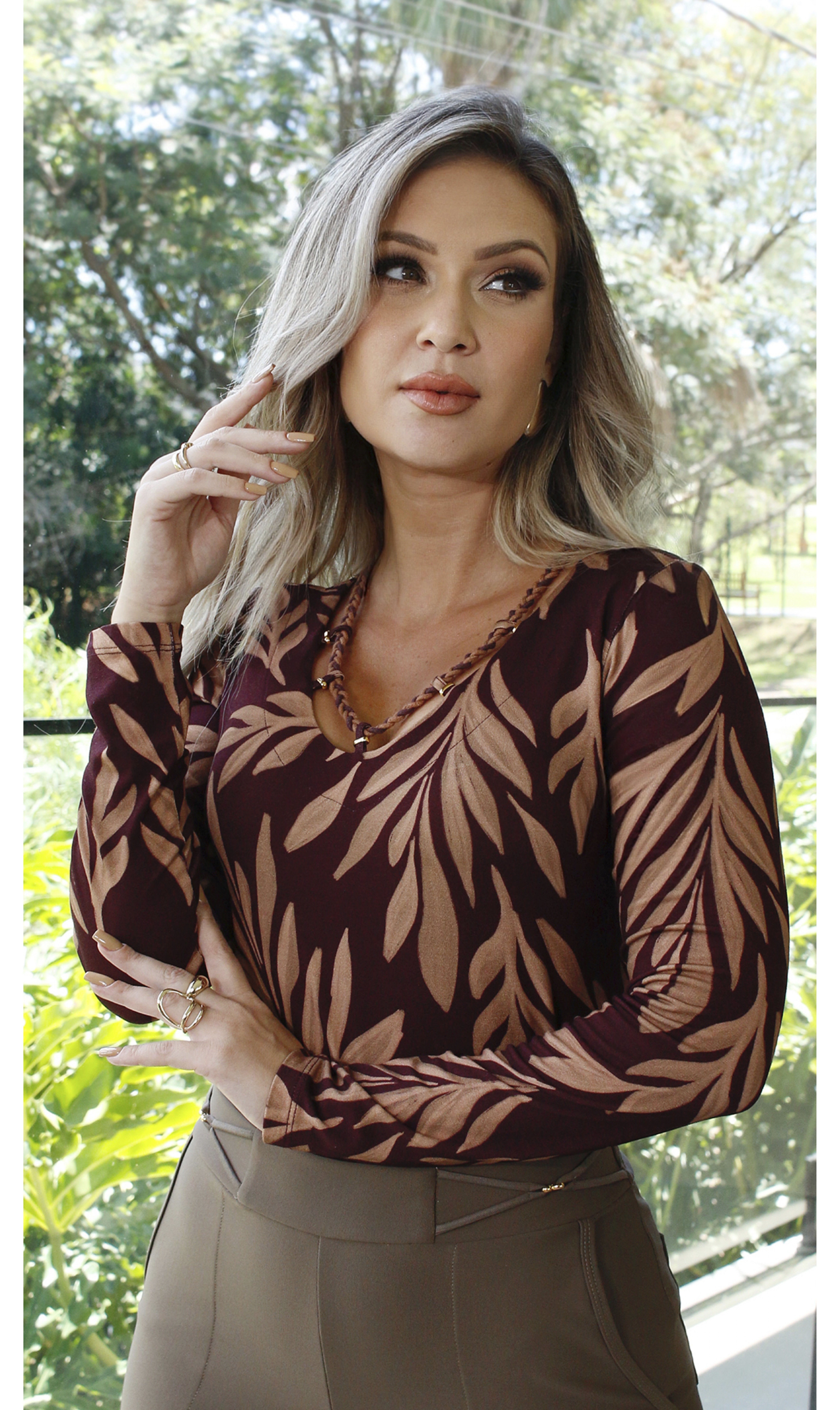 Blusa manga Manga longa com decote em detalhes de debrum e metais. Peça toda confeccionada em malha e extremo conforto e um excelente caimento.