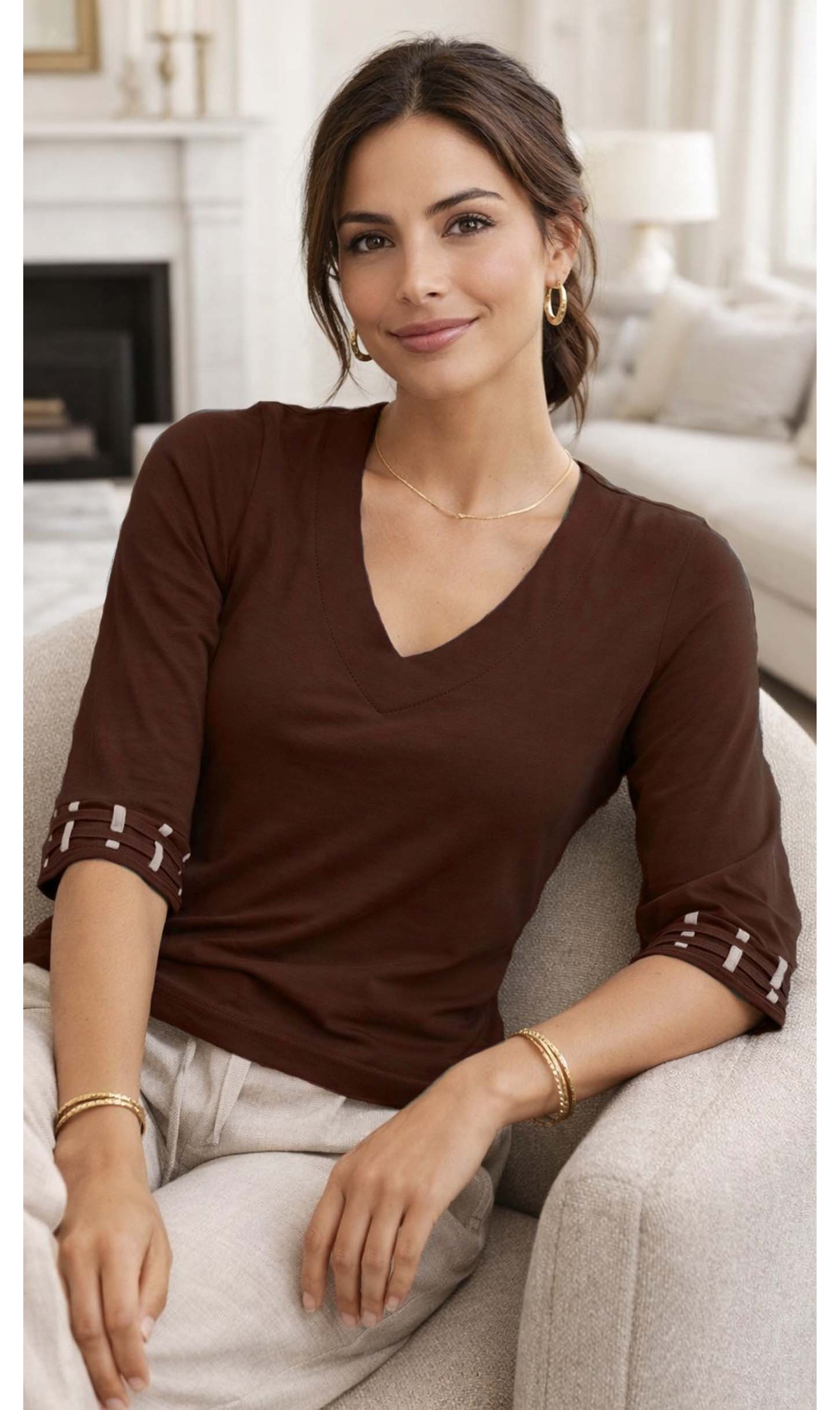 Blusa manga 3/4 com decote V e revel, que valoriza o acabamento com elegância. As mangas ganham destaque com lindos detalhes nos punhos em traças entrelaçadas feitas à mão, agregando um toque artesanal e sofisticado à peça.