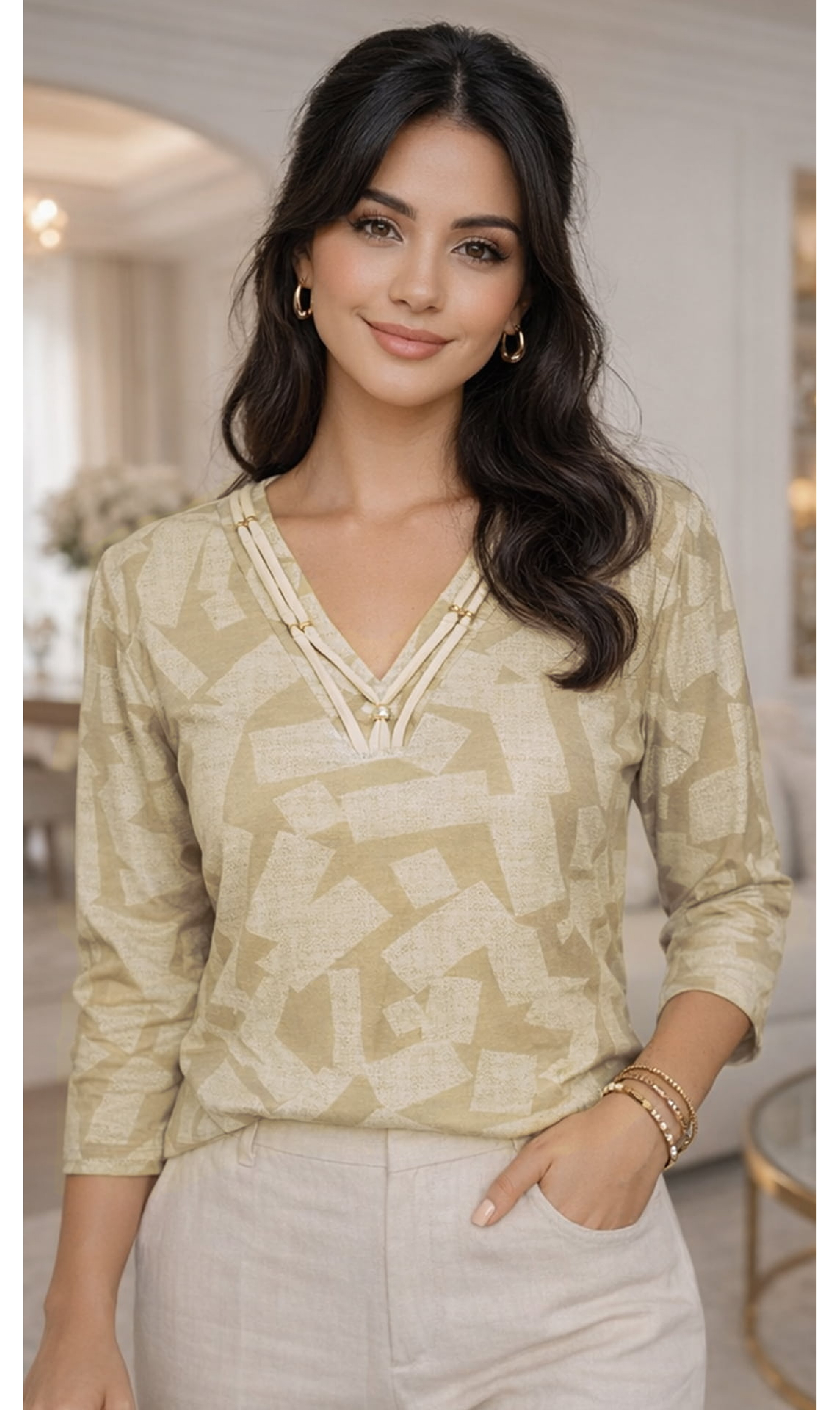 Blusa manga 3/4 com estampa exclusiva Ramany. Possui decote V com recorte duplo e detalhes de tiras de algodão com aplicação de peças metálicas, trazendo um toque moderno e sofisticado à peça.