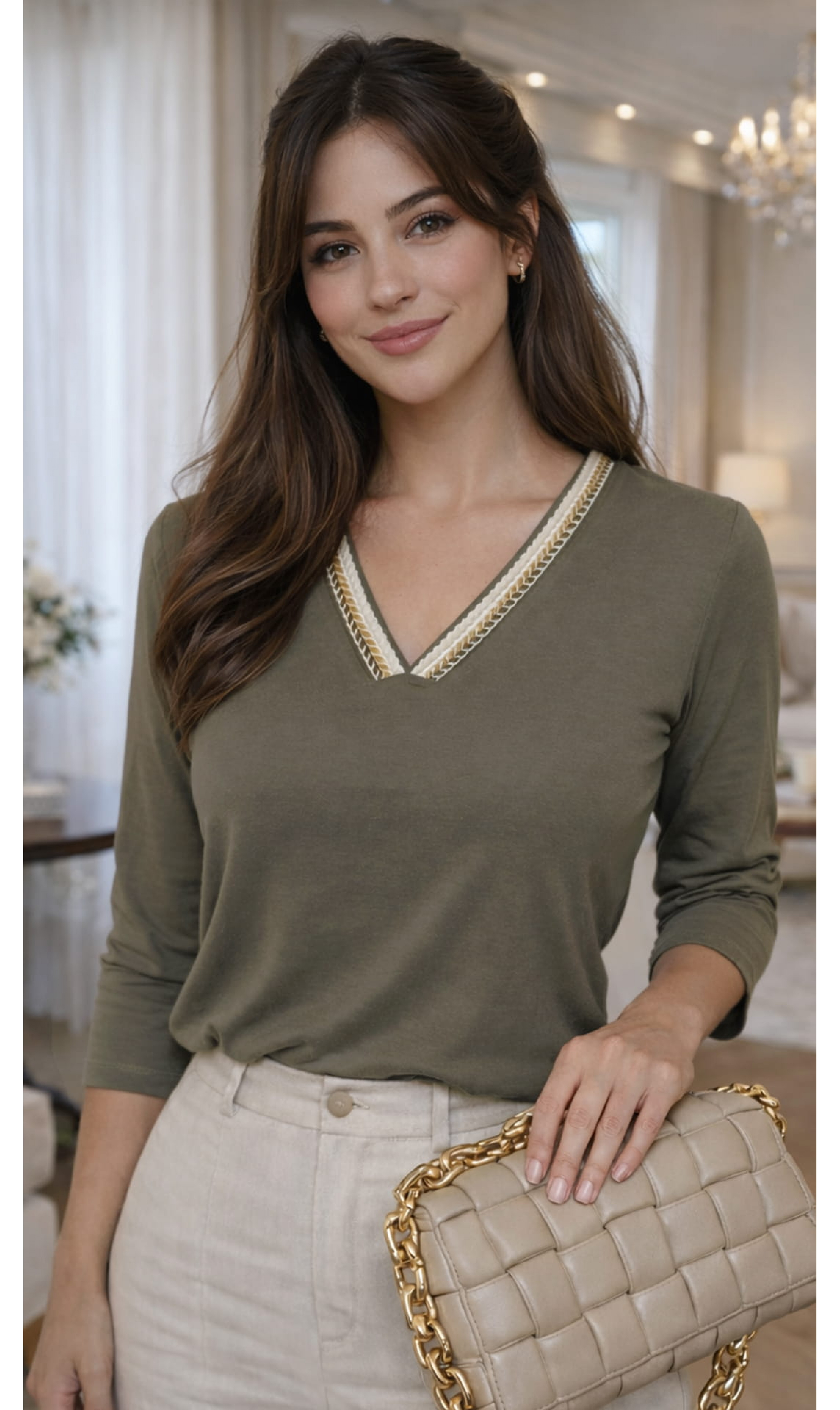 Blusa manga 3/4 com decote V valorizado por detalhe em aviamento de algodão, que agrega charme e um acabamento diferenciado ao design.