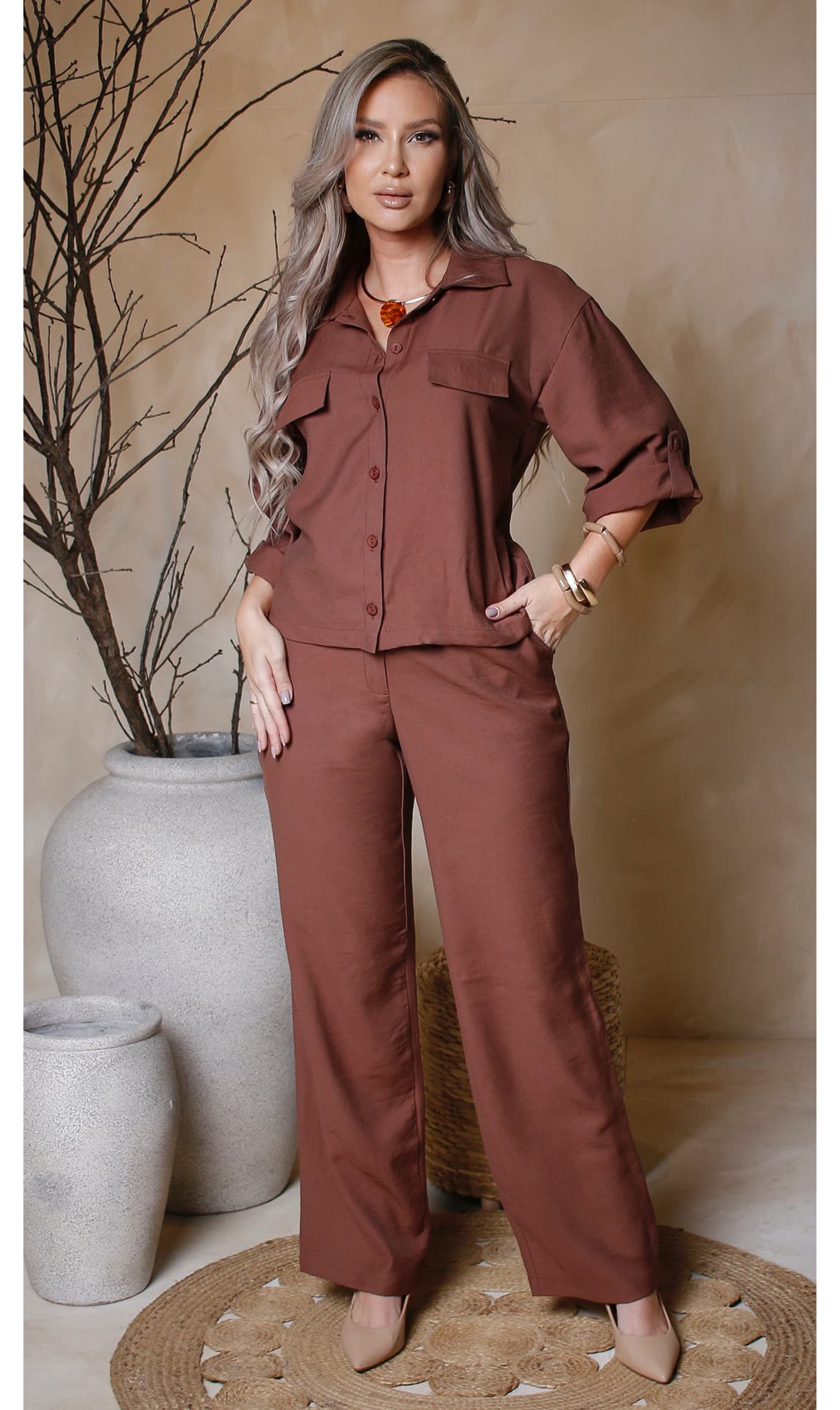 Conjunto Ramany em tecido plano à base de viscose, que une elegância e versatilidade. A camisa manga 3/4 possui botões funcionais, lapela e martingale nas mangas, trazendo um toque clássico e sofisticado ao design. A calça conta com bolso embutido frontal e cós com elástico, garantindo praticidade e conforto ao vestir.