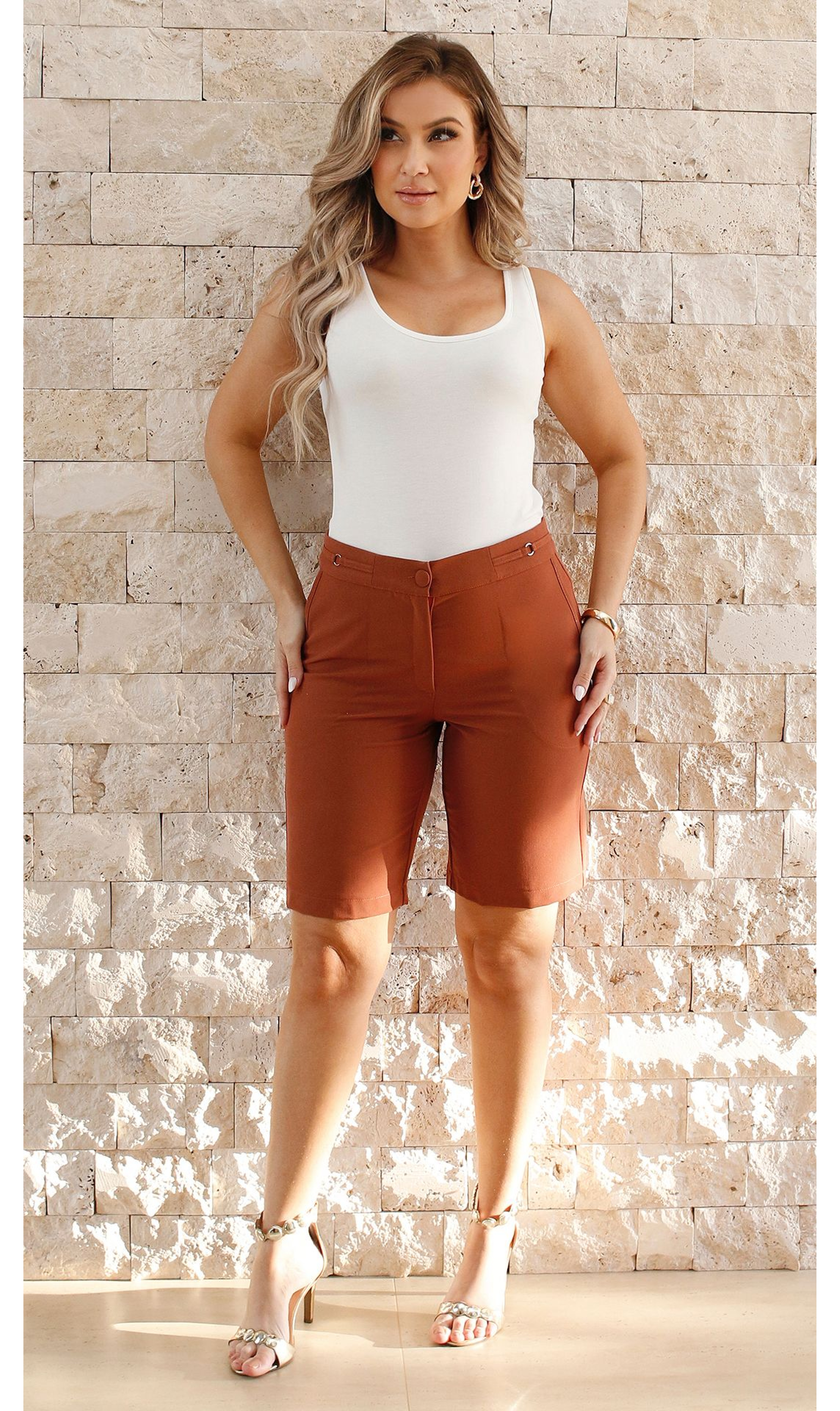 Shorts Ramany de tecido plano. Cós duplo com detalhes de tiras de tecido e peças de metais. Bolso embutido na frente. Peça toda confeccionada em tecido e extremo conforto e um excelente caimento.