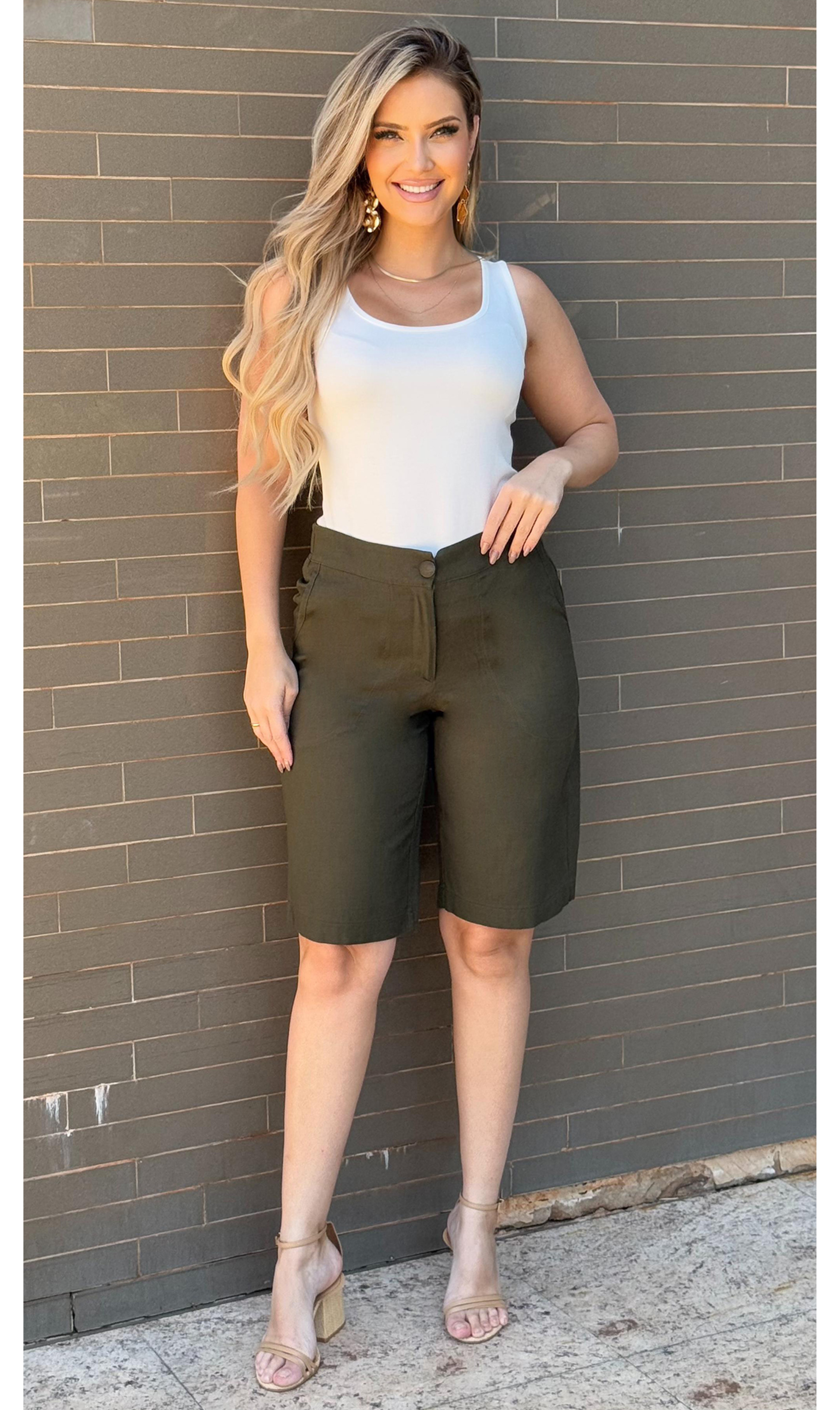 Bermuda Ramany em tecido plano (Alfaiataria). Bolsos embutidos, vista com zíper e cós com elástico e botão encapado. Peça toda confeccionada em tecido de extremo conforto e um excelente caimento.