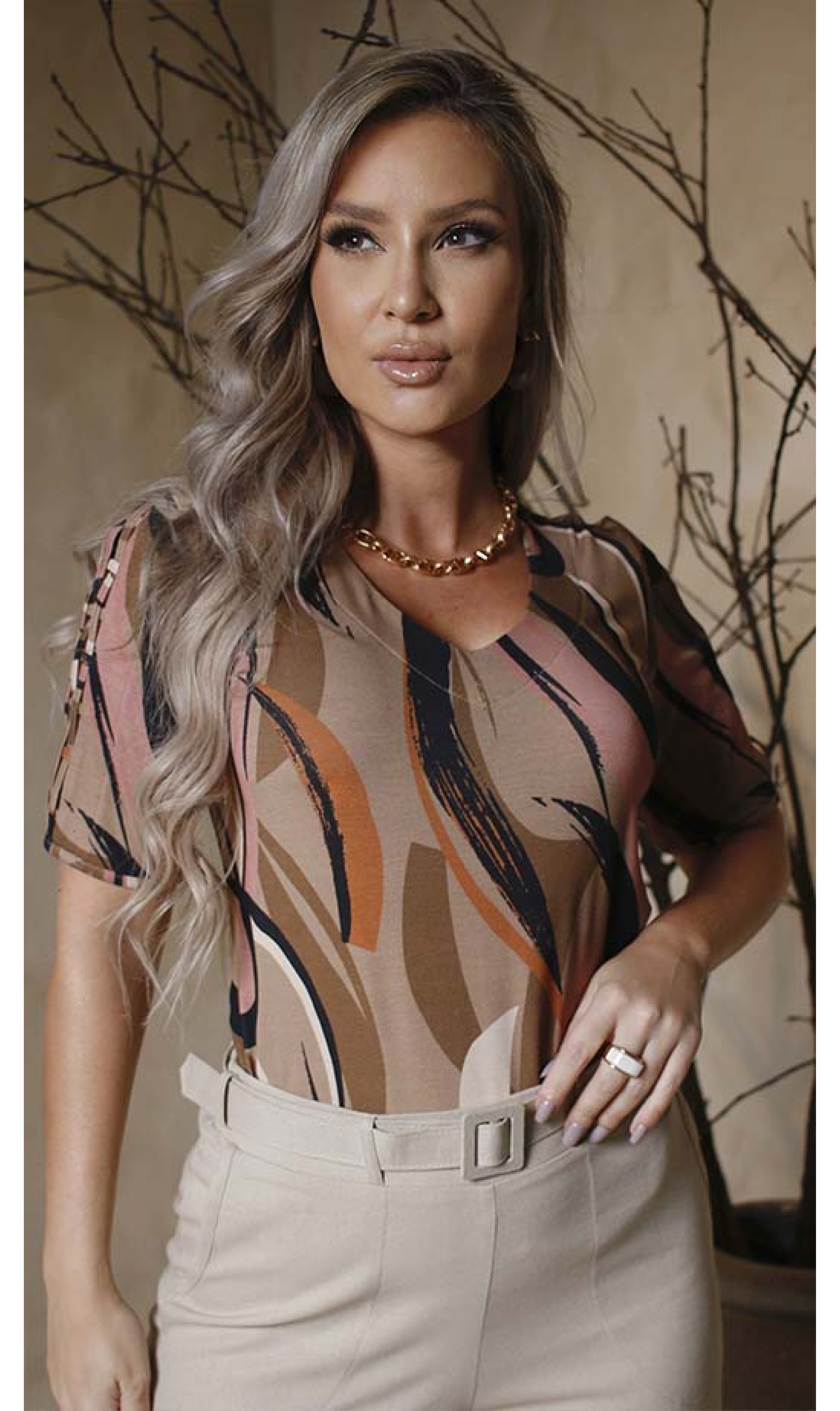 Blusa manga curta com estampa exclusiva Ramany e decote V com revel, que valoriza o acabamento e traz mais sofisticação ao visual. As mangas ganham destaque com trabalhado trançado em tiras de tecido, agregando charme e modernidade à peça.