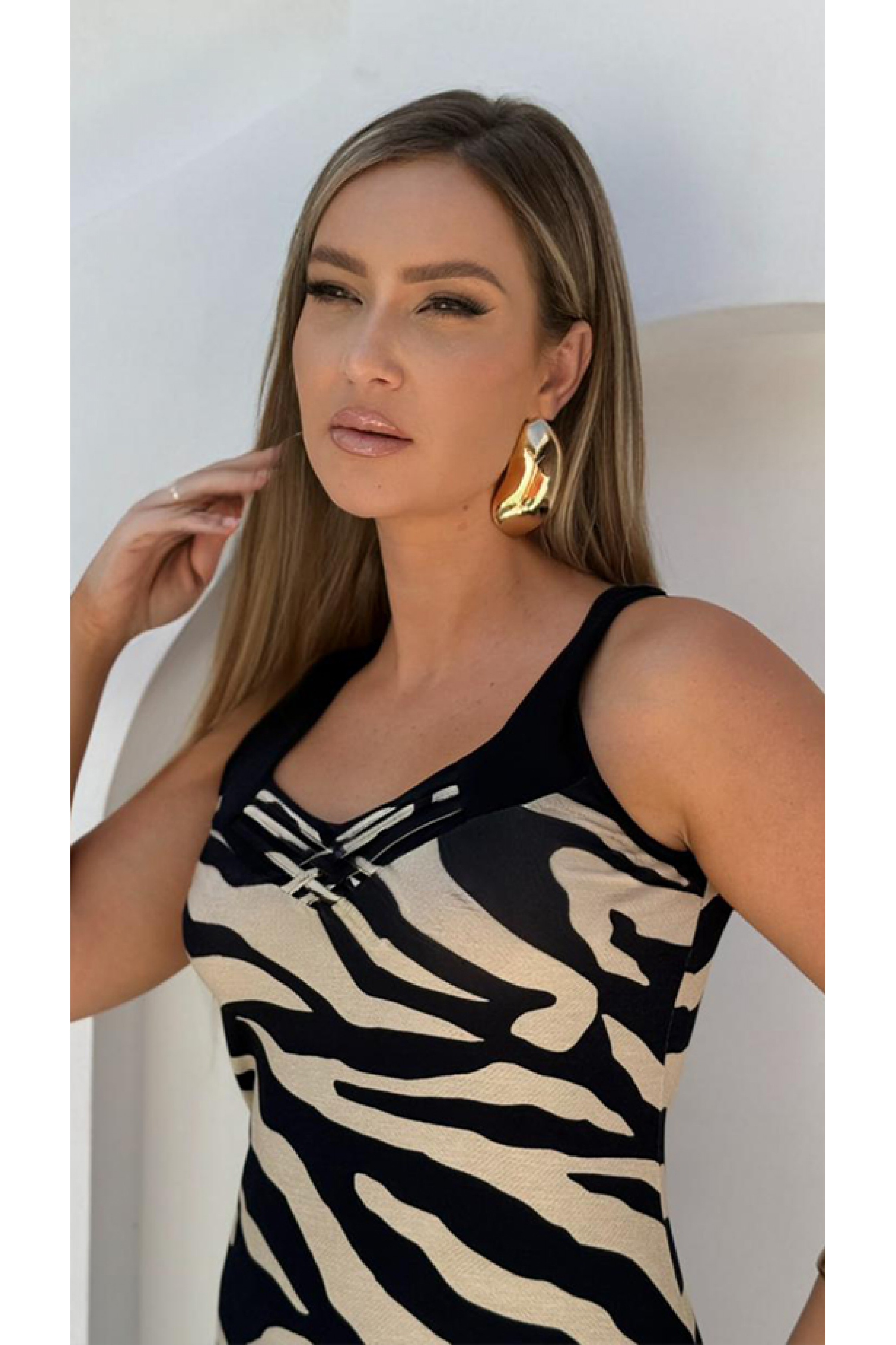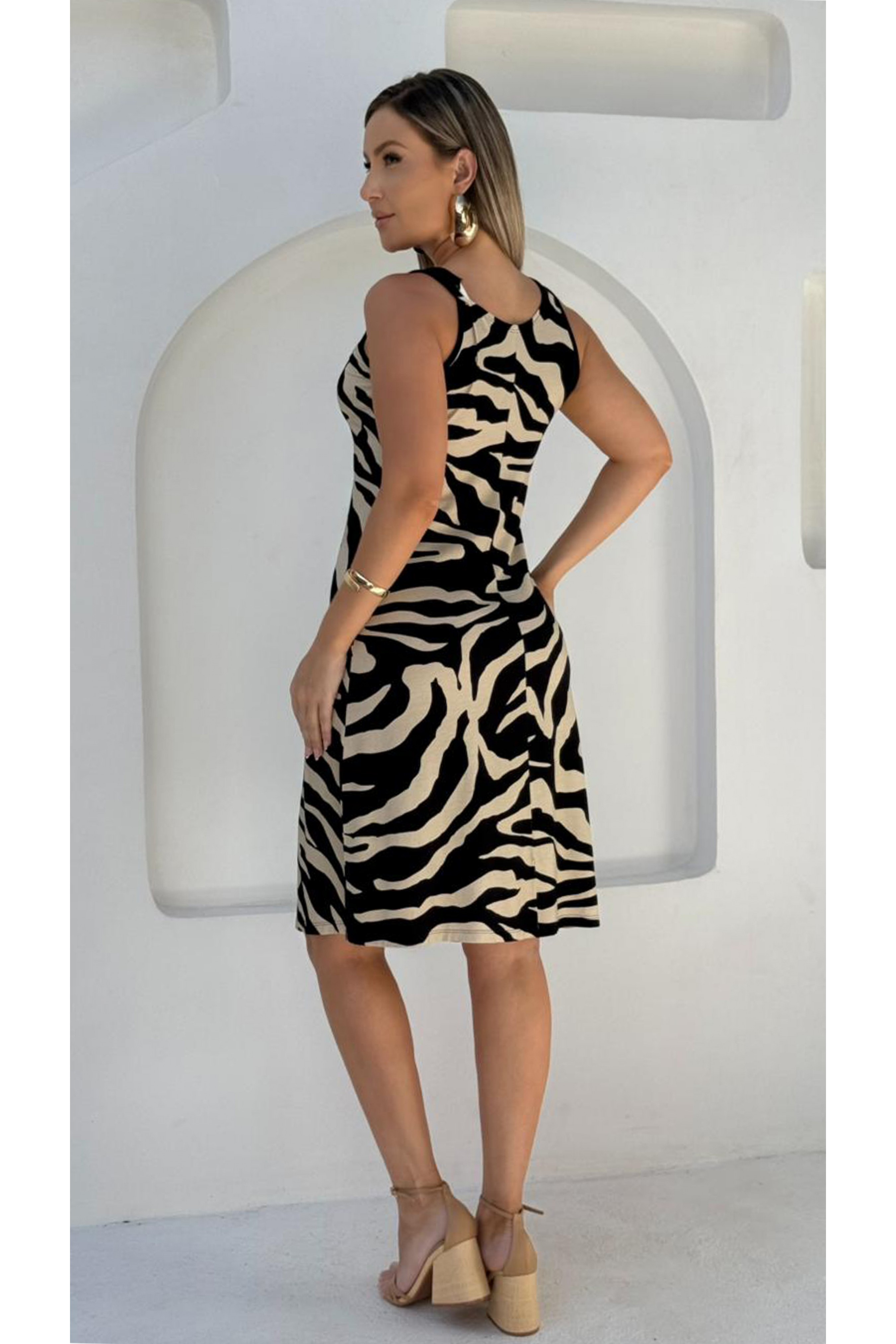 Vestido regata com estampa exclusiva Ramany. Decote V com recorte e detalhes de tiras de tecido entrelaçadas. Peça toda confeccionada em malha  que possui extremo conforto e um excelente caimento.